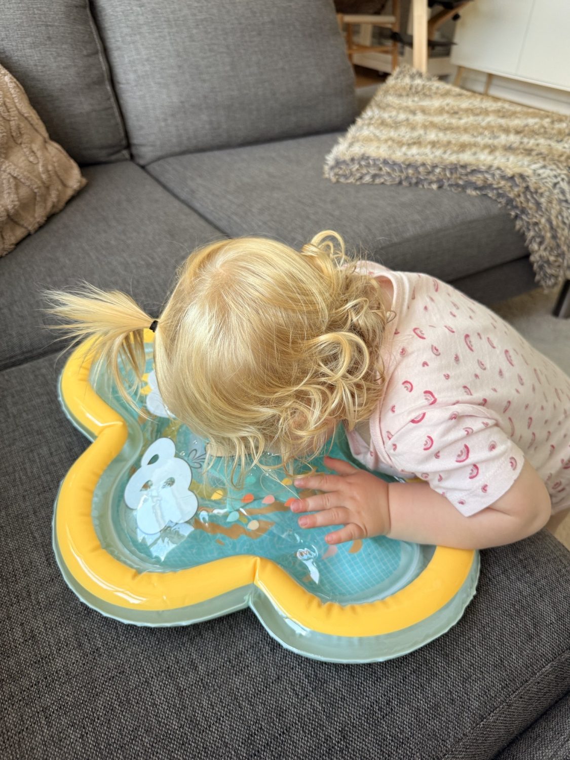 VandlegemÄtten er udviklet til at gÞre mavetid sjovere og mere motiverende for baby. Den fyldes med vand i midten og luft i kanten, sÄ barnet kan trykke pÄ overfladen og se smÄ figurer bevÊge sig rundt. Kombinationen af farver, bevÊgelse og lyde giver masser af sanseindtryk og motiverer barnet til at lÞfte hovedet og styrke nakke og overkrop.