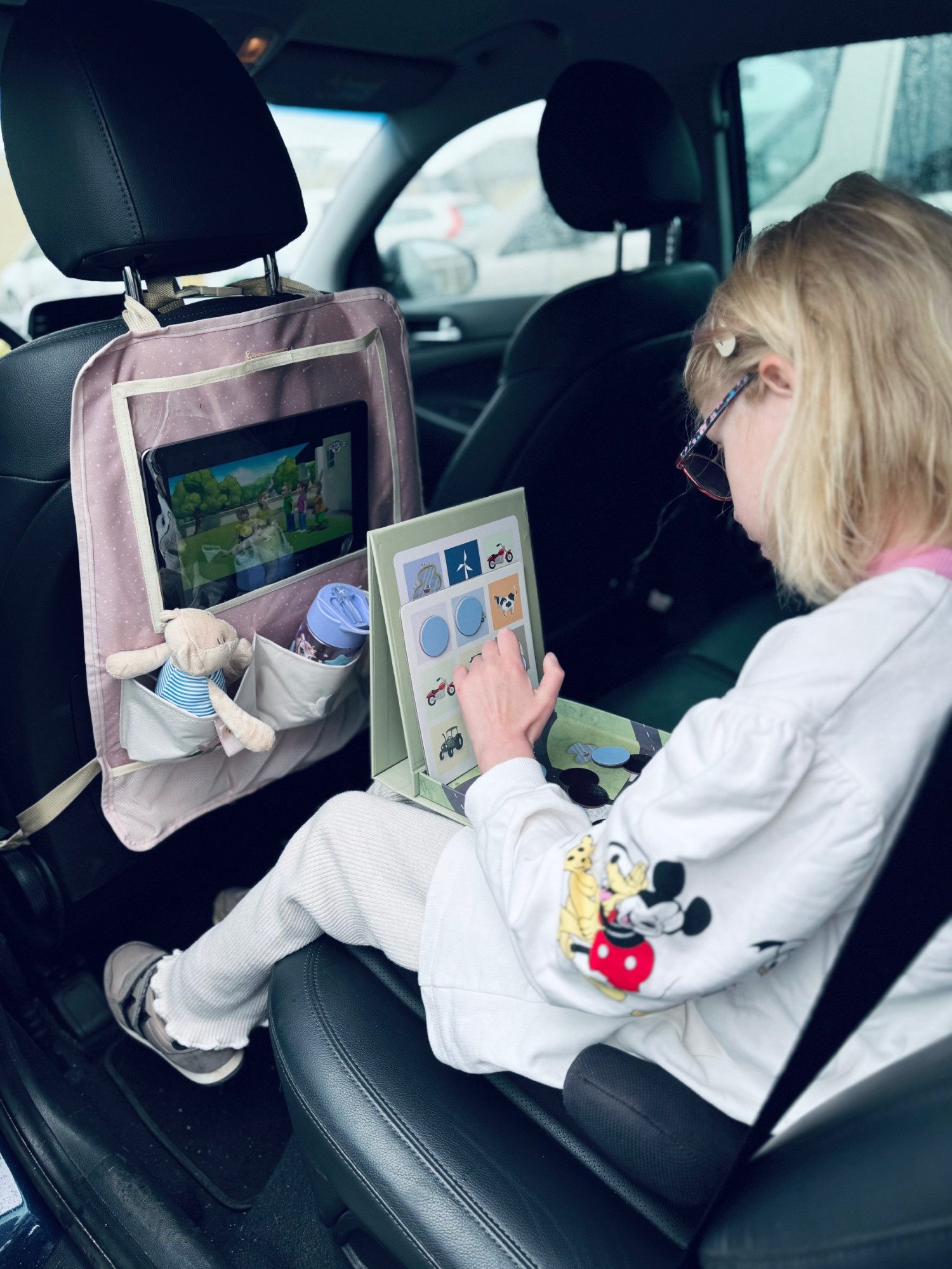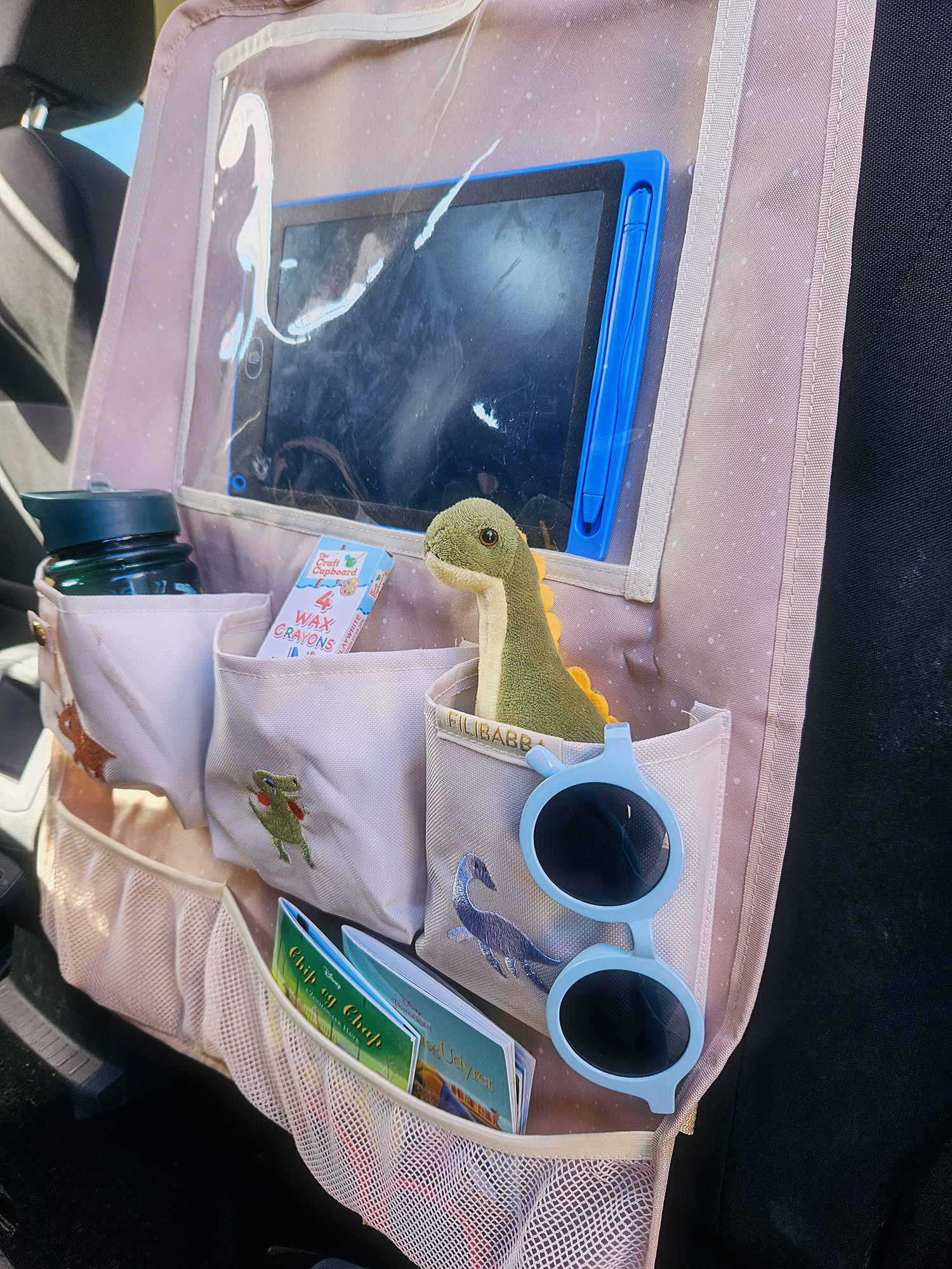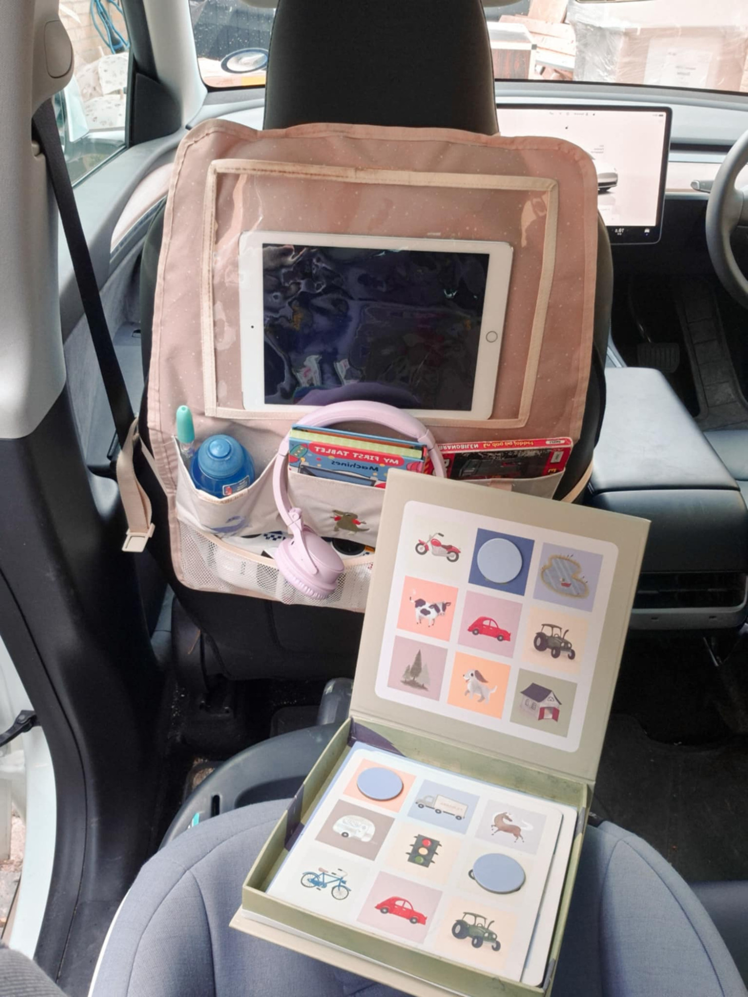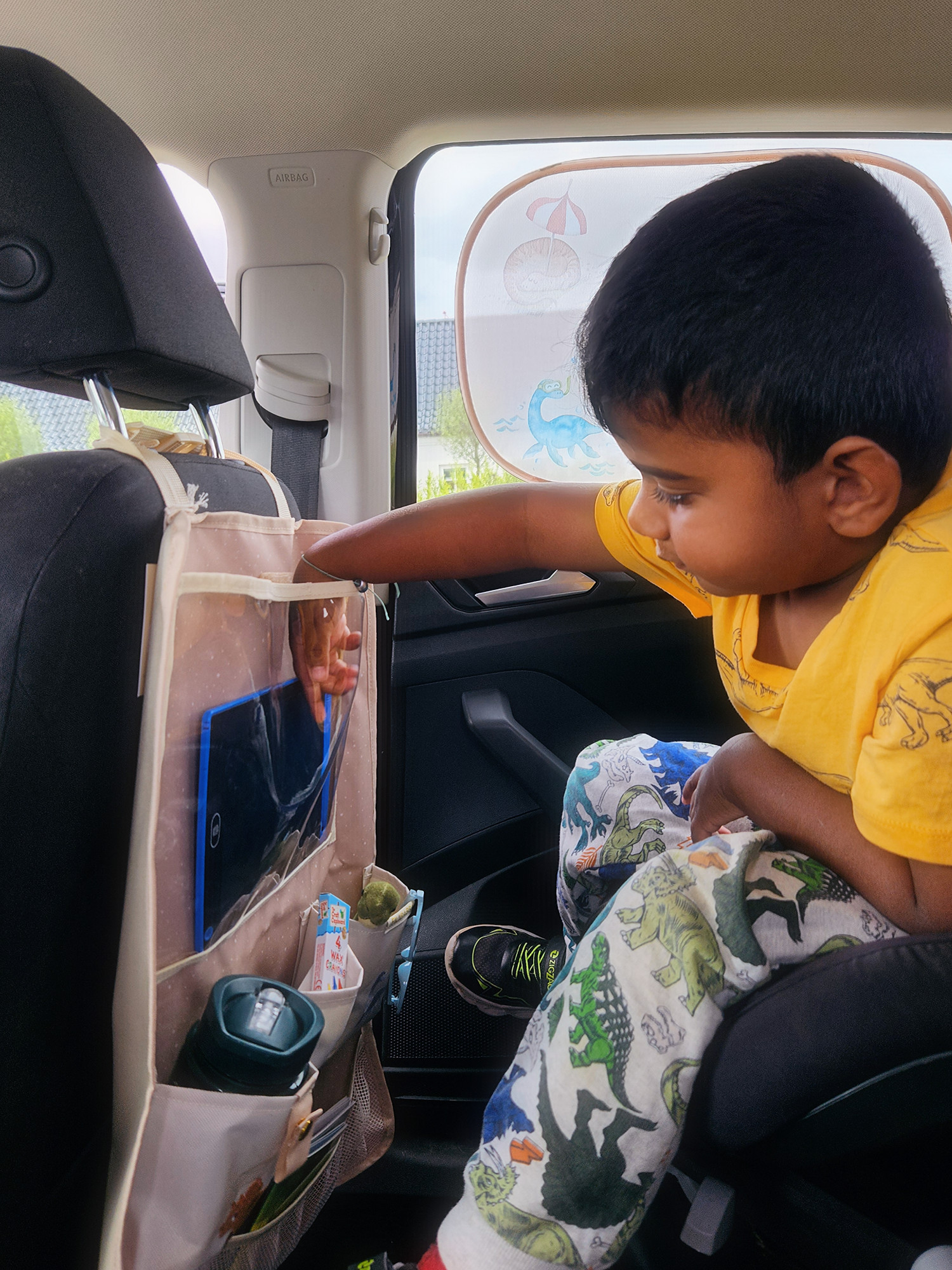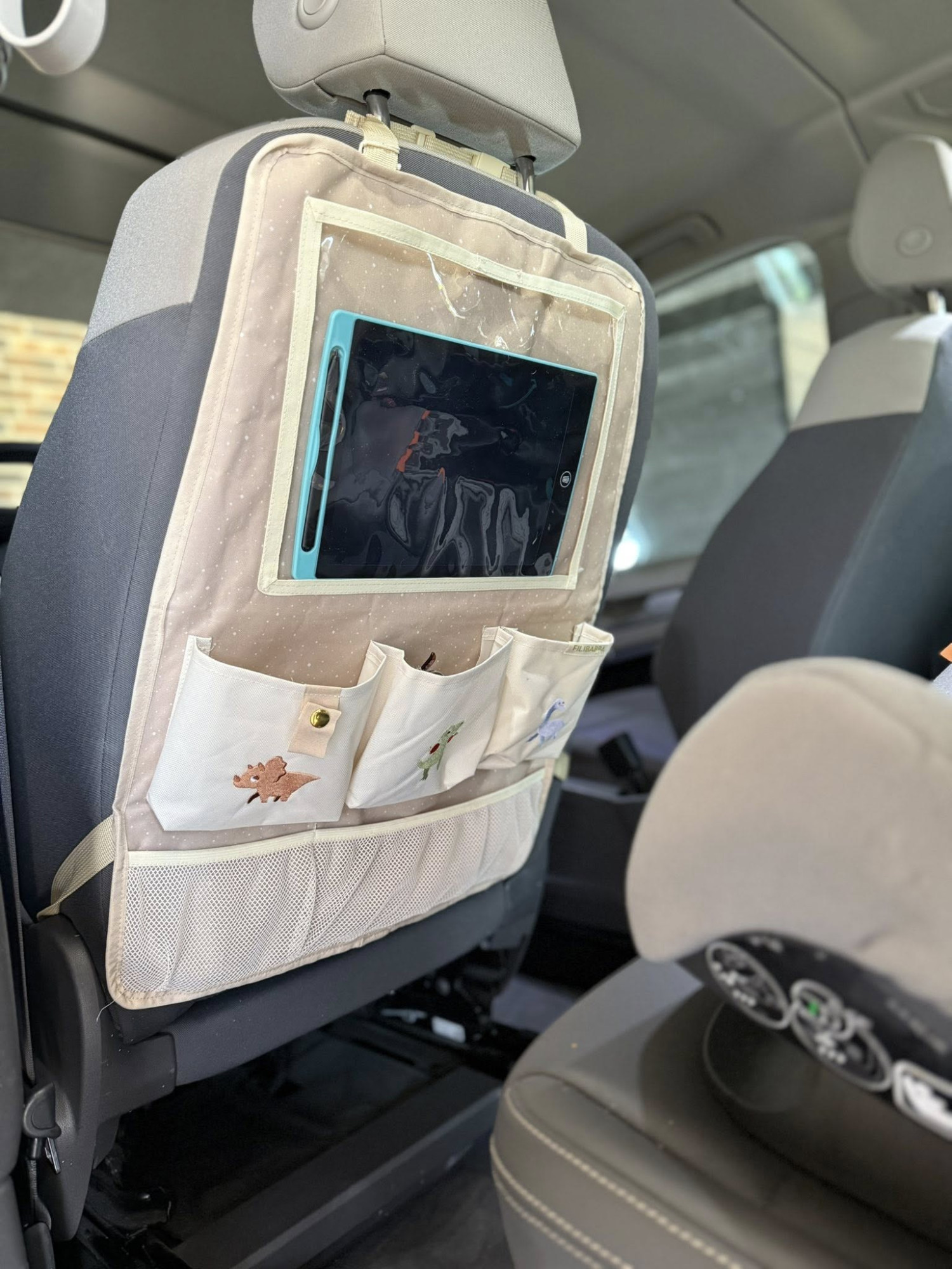 - Organizer til ryglĂŠnet â en praktisk opbevaringslĂžsning til bilen med plads til tablet, legetĂžj, drikkedunk og snacks.