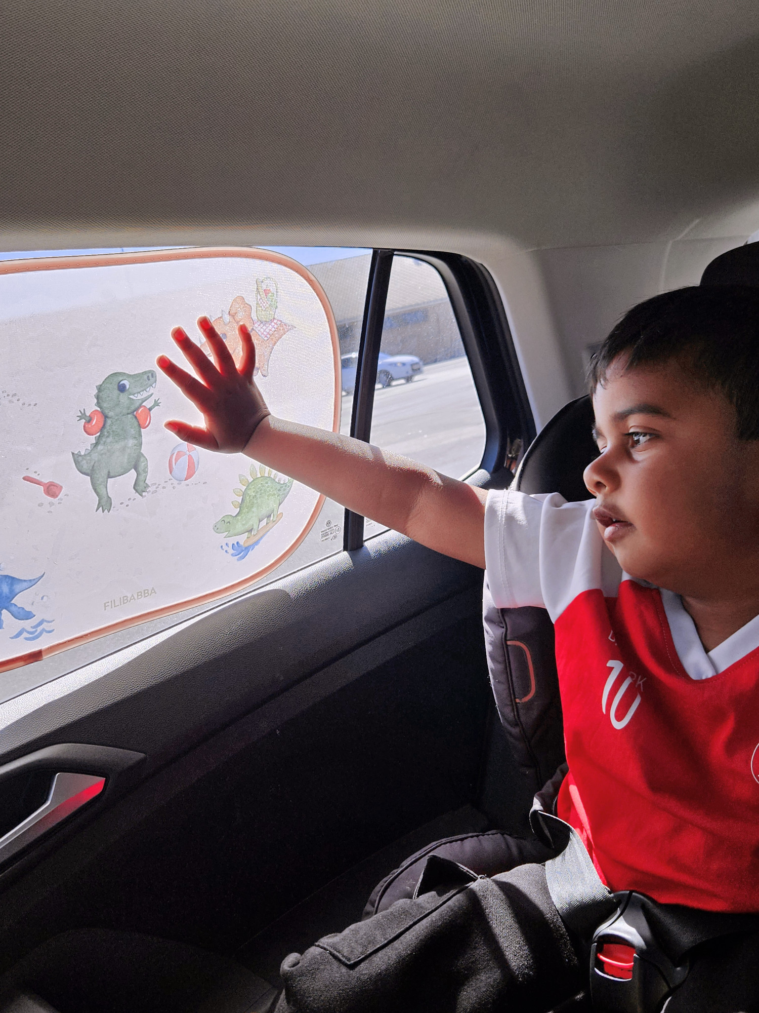 Hector er klar til bilferie â med dino-kuffert, bingo og smarte solskĂŠrme fra FILIBABBA