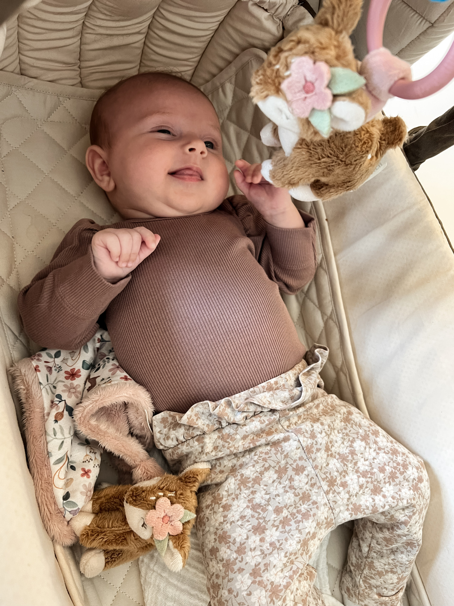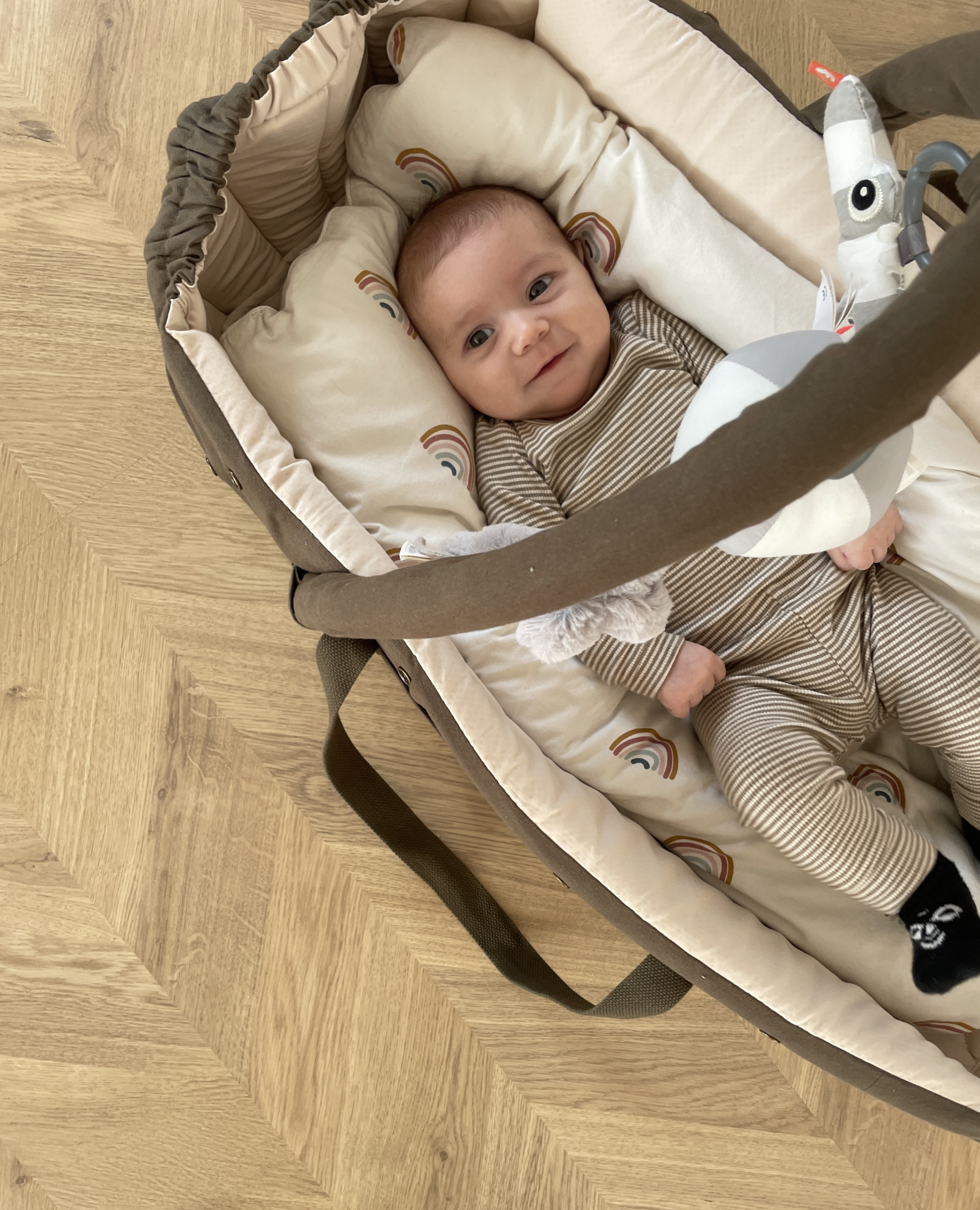 sĂĽ baby kan ligge og underholde sig selv med legetøj.â