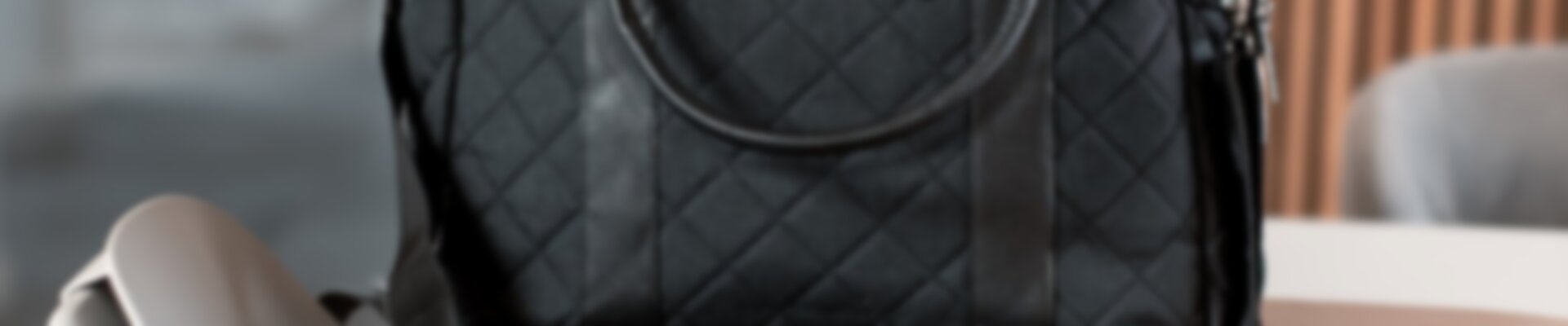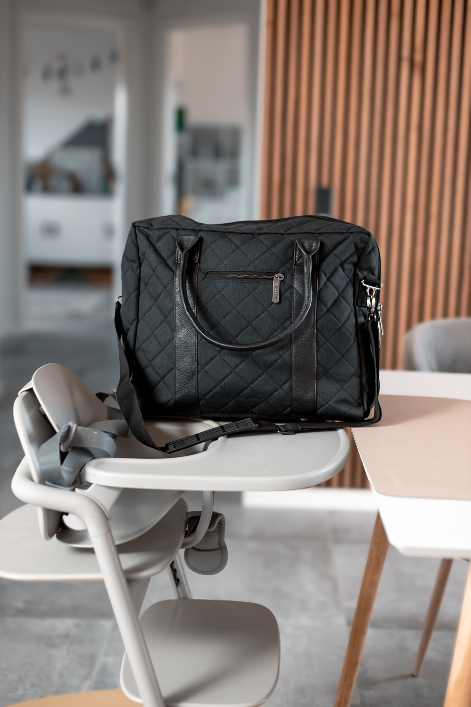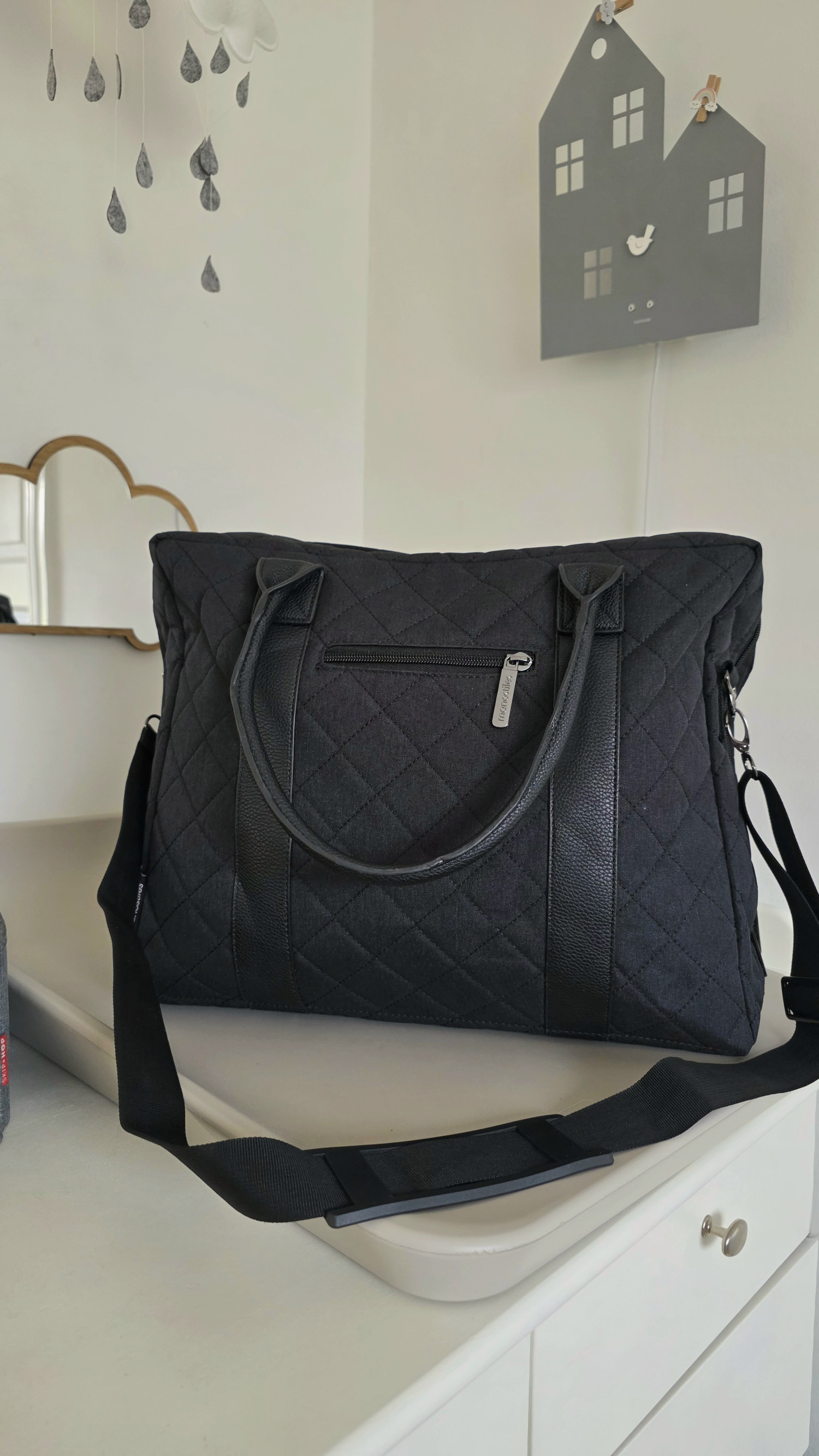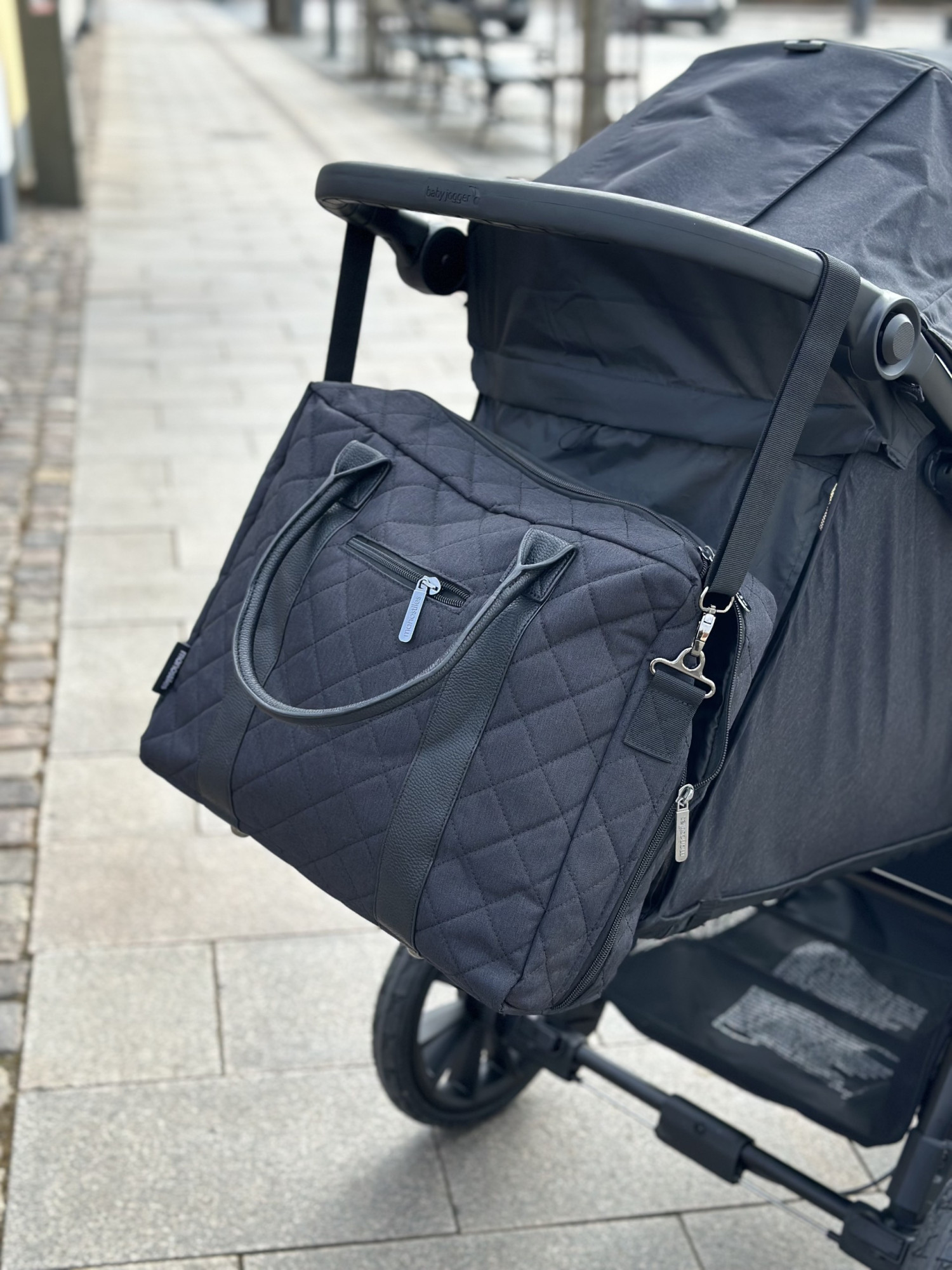 Designet er samtidig stilrent med quiltet look og flotte lÊderhanke, og tasken kan bÄde bÊres over skulderen eller hÊnges pÄ barnevognen med den justerbare rem.