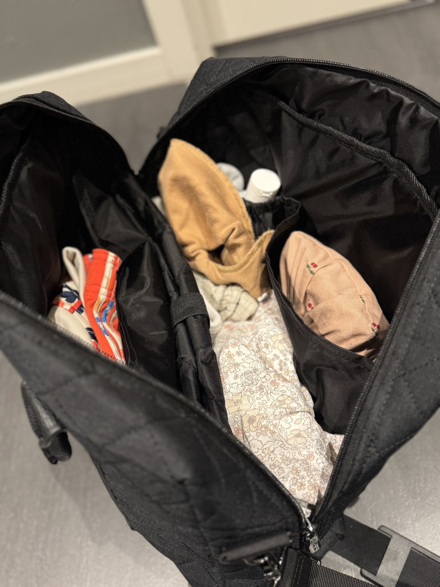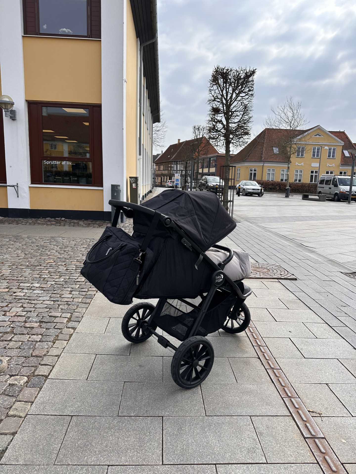 Tasken har god plads til skiftetĂžj, bleer, snacks og drikkedunke til to bĂžrn. For Nora fungerer den perfekt til familiens behov i hverdagen.