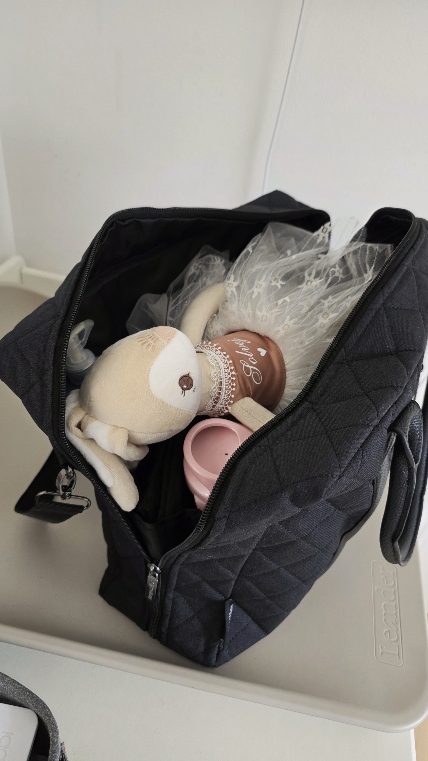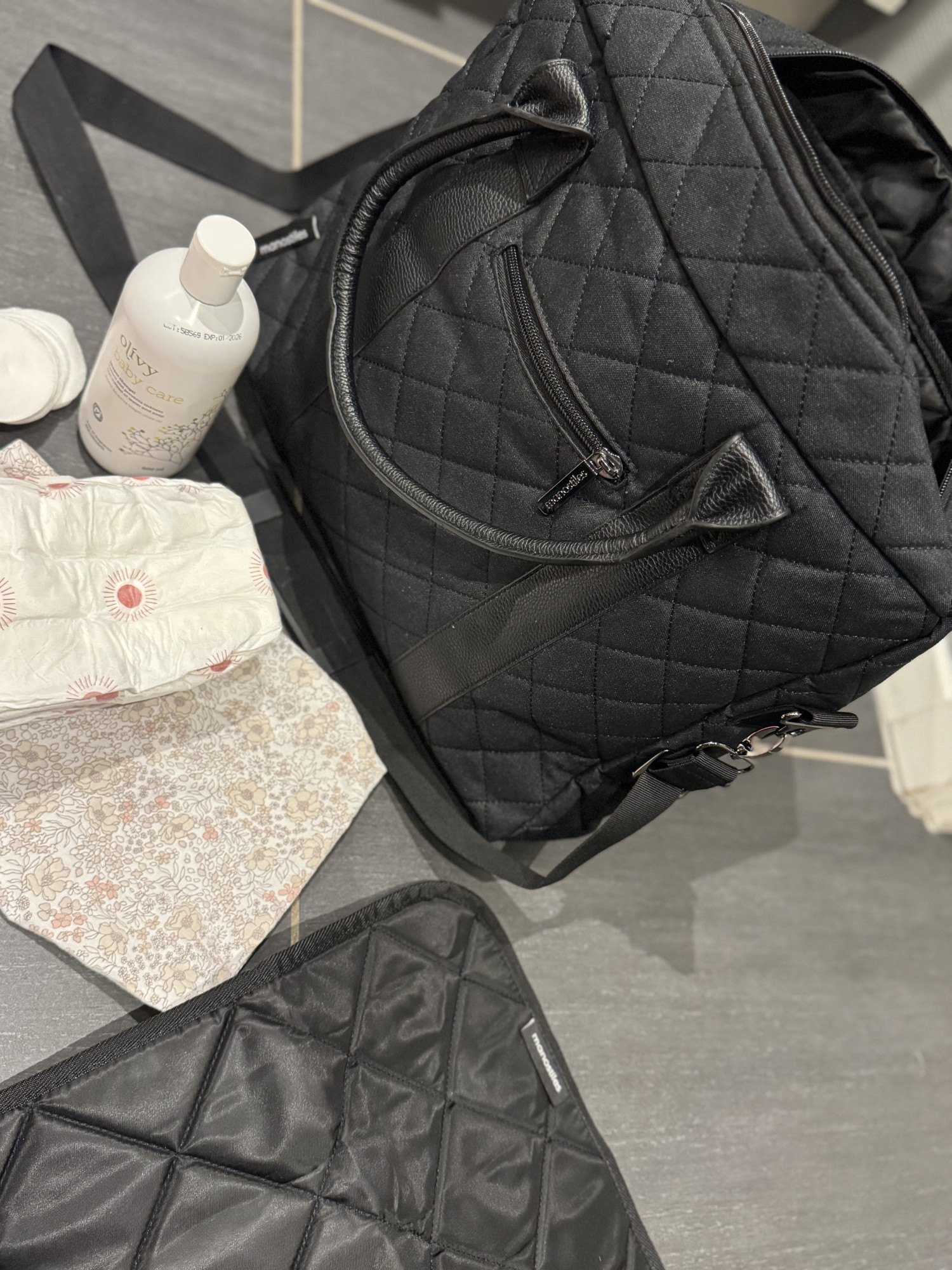 Pusletasken er designet med fokus pĂ„ bĂ„de funktionalitet og ĂŠstetik. Den har et stilrent quiltet look, lĂŠderhanke og en vandafvisende overflade, som gĂžr den velegnet til hverdagen med smĂ„ bĂžrn â ogsĂ„ i det omskiftelige danske vejr.