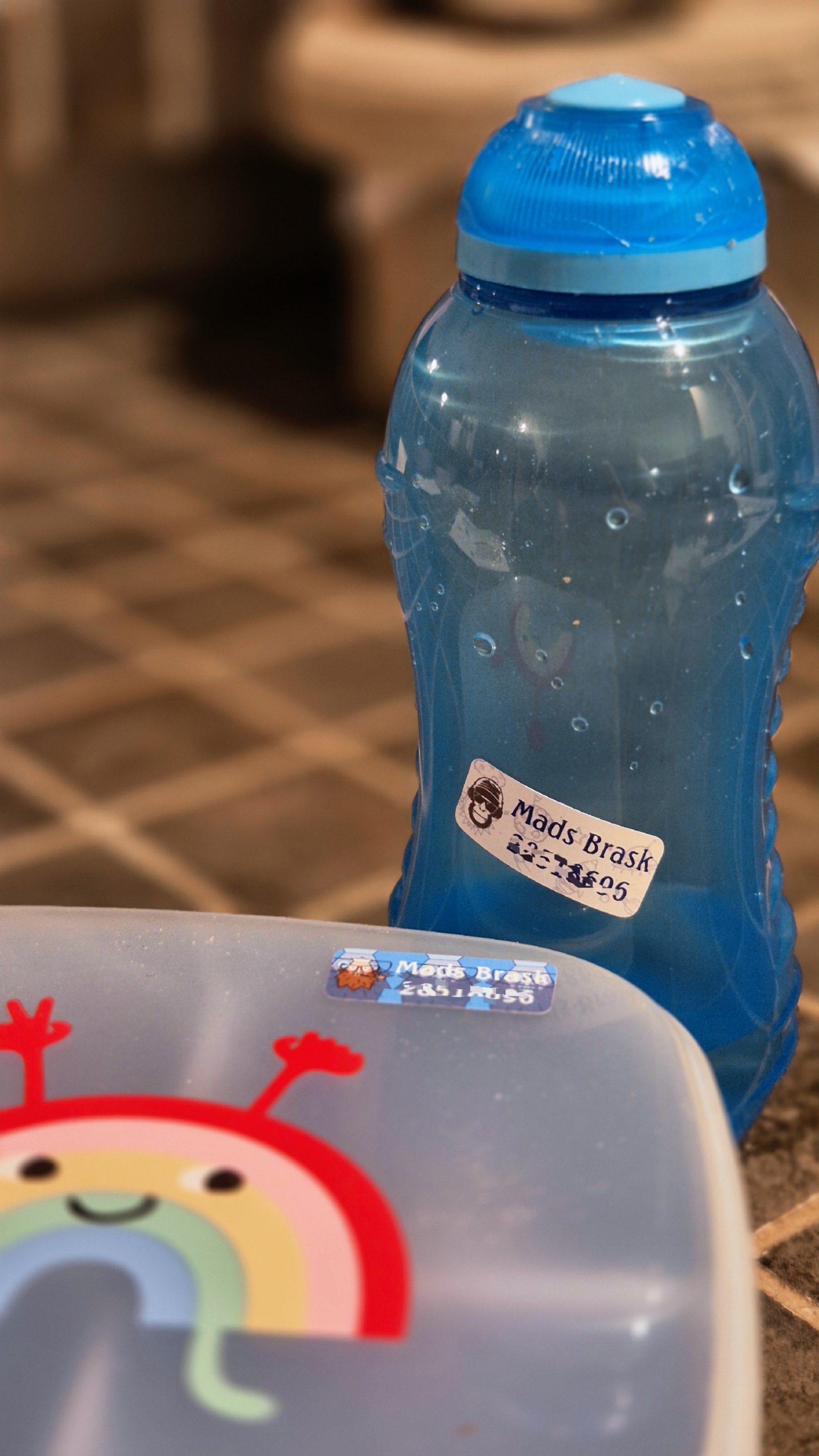 Ann-Charlott beskriver navnemærkerne som en uundværlig del af hverdagen. Hos dem bliver de brugt på alt fra huer og vanter til drikkedunke, madkasser, sko og tasker – og endda også af de ældre søskende i træningstøj.