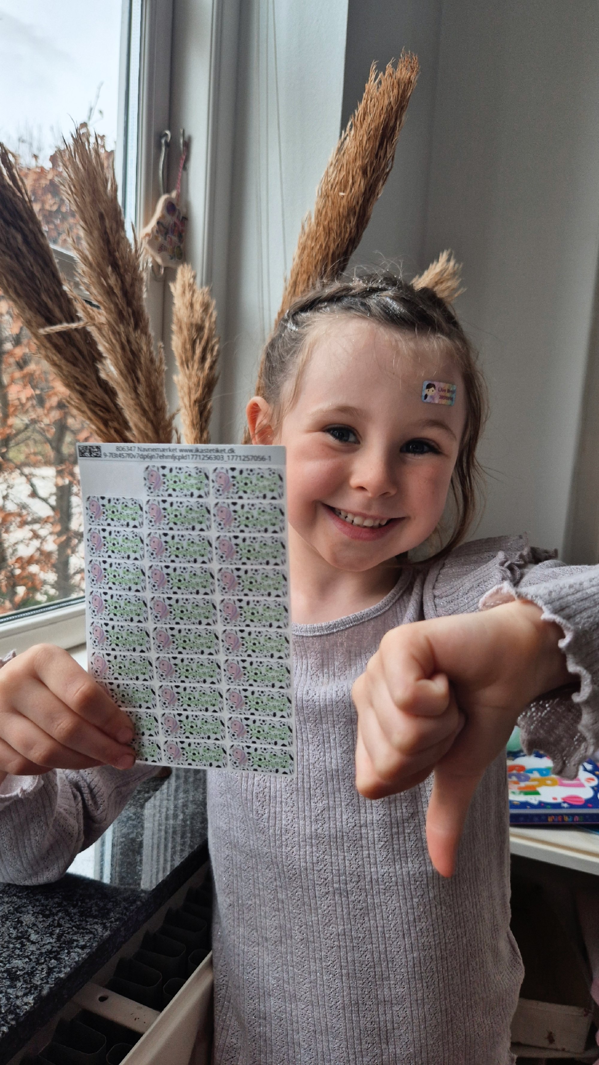 Cecilie-Valentina beskriver navnemærkerne som en stor hjælp i en travl hverdag, hvor de gør det lettere at holde styr på børnenes ting i både institution og skole. Hun fremhæver især, at de er nemme at sætte på og bliver siddende, også efter mange vaske og daglig brug.