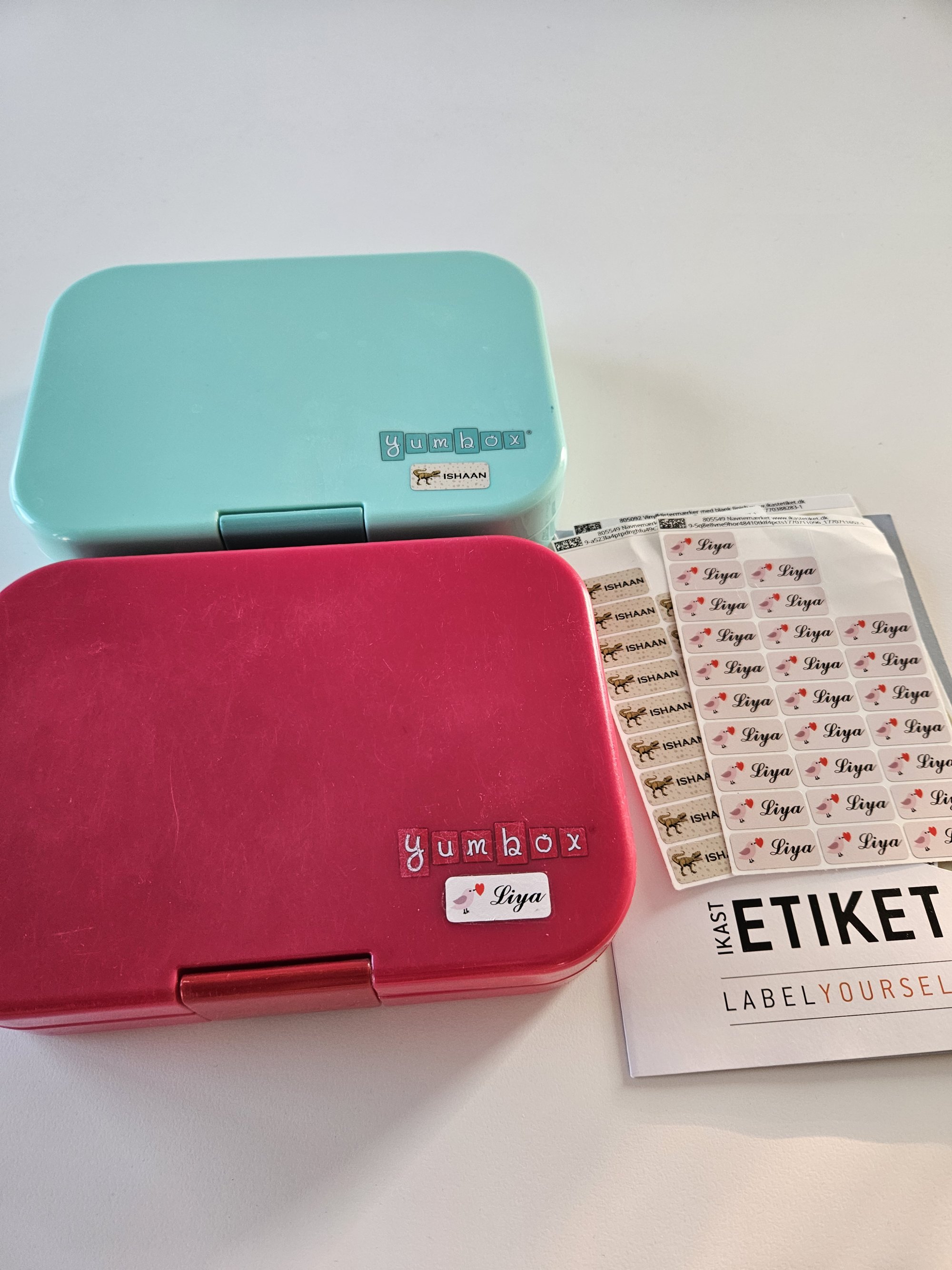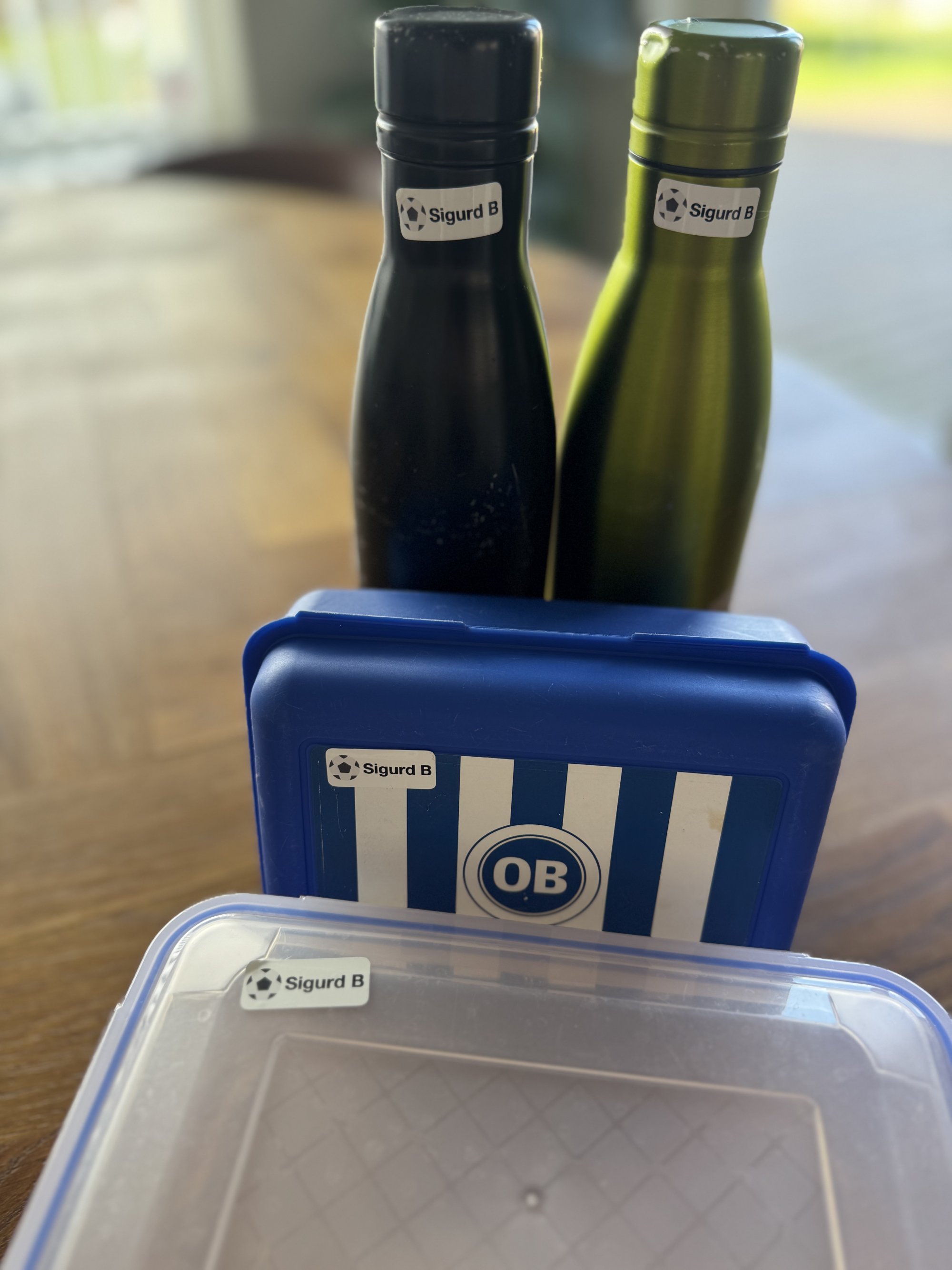 Mette har testet både almindelige navnemærker og minimærker. De almindelige mærker har især været gode til madkasser, drikkedunke, skiftetøj og støvler, mens minimærkerne allerede nu virker som en oplagt løsning til skolestart og alle de små ting i penalhuset.
