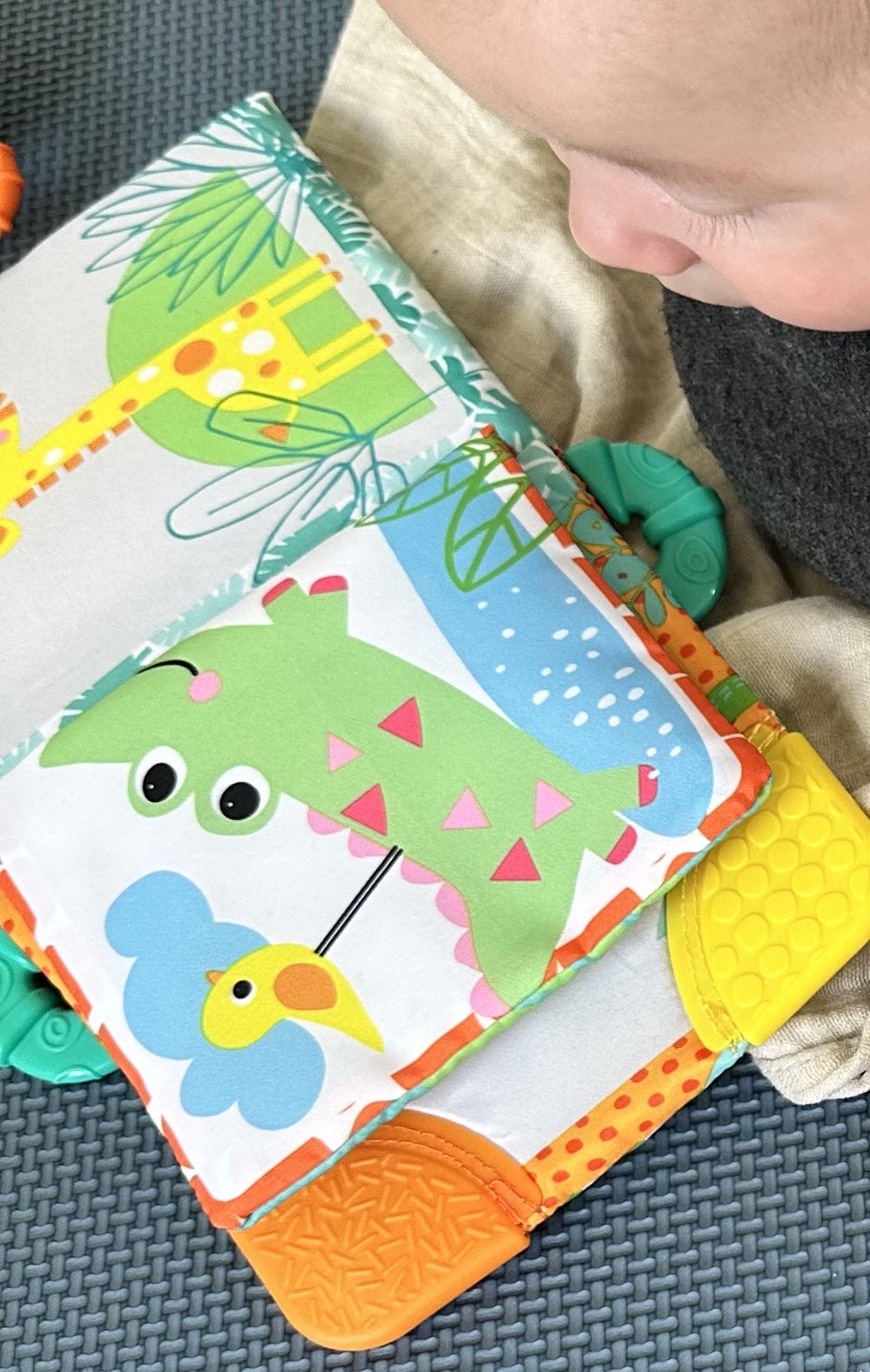 Bogen kombinerer flere funktioner i Êt stykke legetøj. Den er let for smü hÌnder at holde, siderne knitrer, og bideelementet lindrer ømme gummer under tandfrembrud.