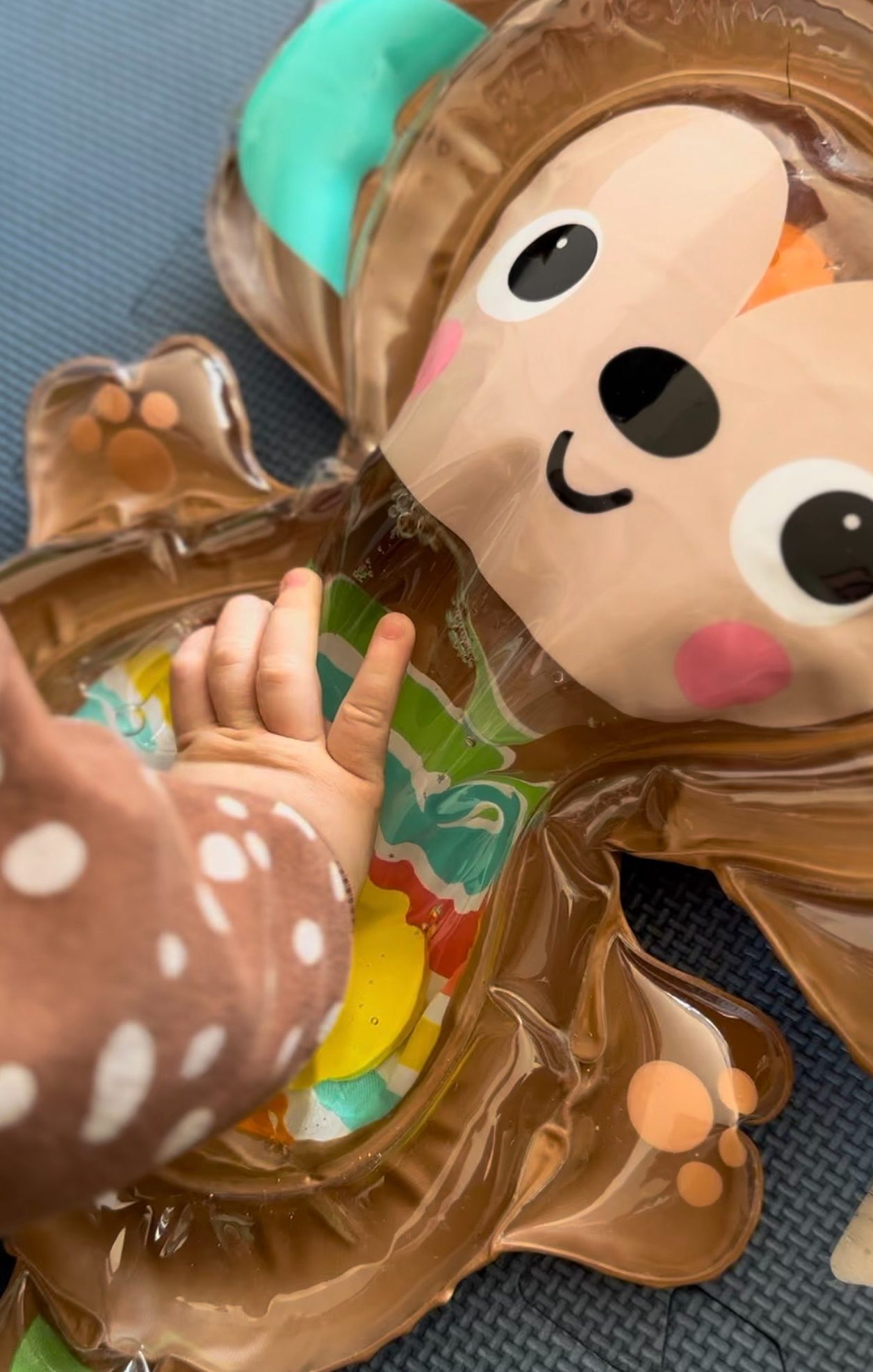 Aktivitetsmütten blev hurtigt en favorit hjemme hos Tristan. Den gør mavetid mere spÌndende, fordi de farverige elementer bevÌger sig rundt, nür barnet trykker pü mütten.