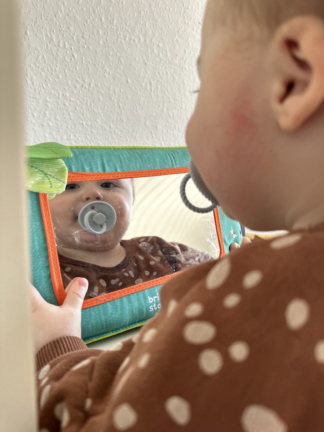 Spejlet giver mulighed for bĂĽde leg og udvikling. Tristan elsker at kigge pĂĽ sig selv og efterligne mimik, hvilket bĂĽde er underholdende og stimulerer barnets selvbevidsthed.