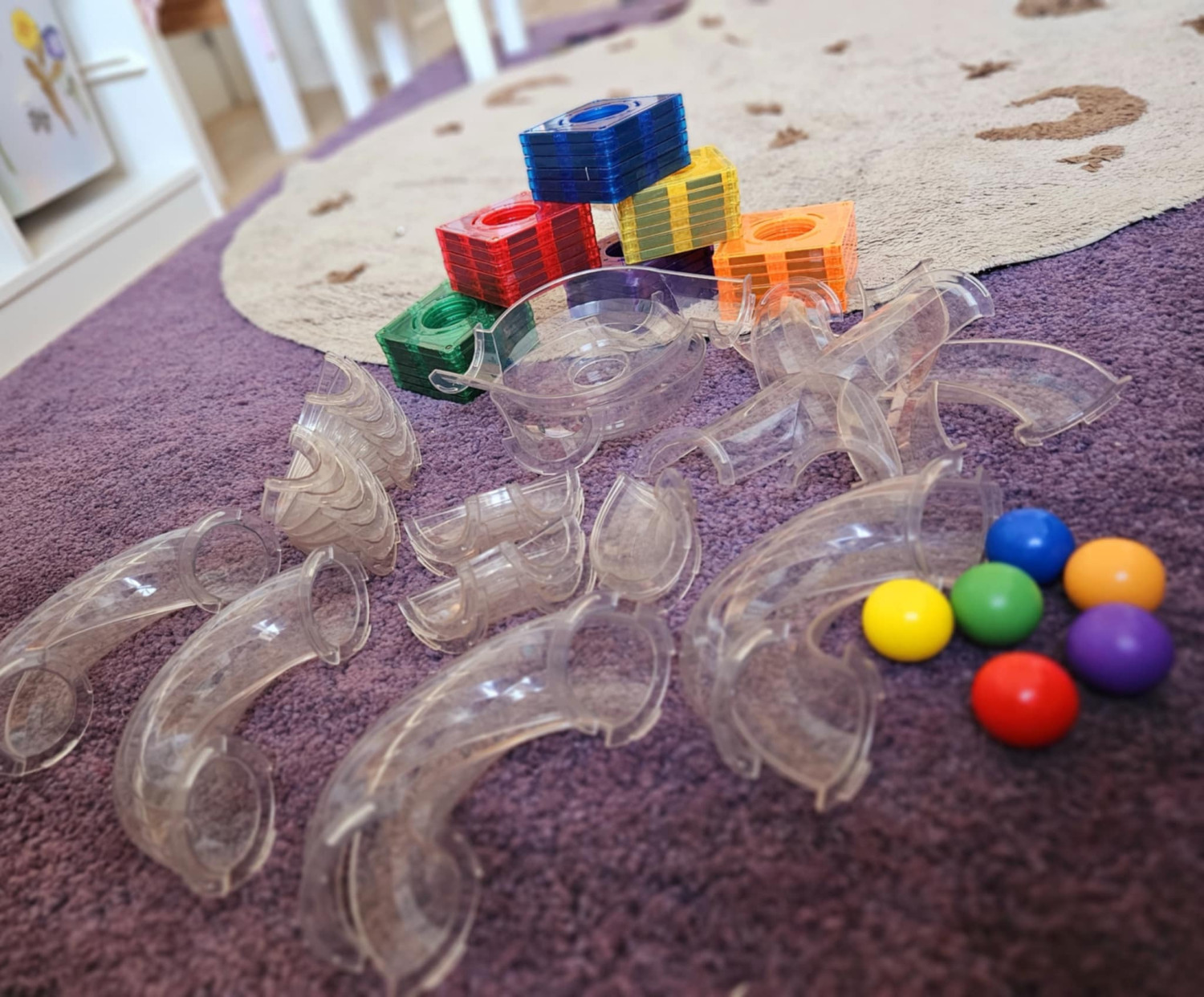 Ball Run Expansion Pack er et udvidelsessæt, der gør det muligt at bygge kuglebaner med magnetbrikker, gennemsigtige rør og farvede kugler.