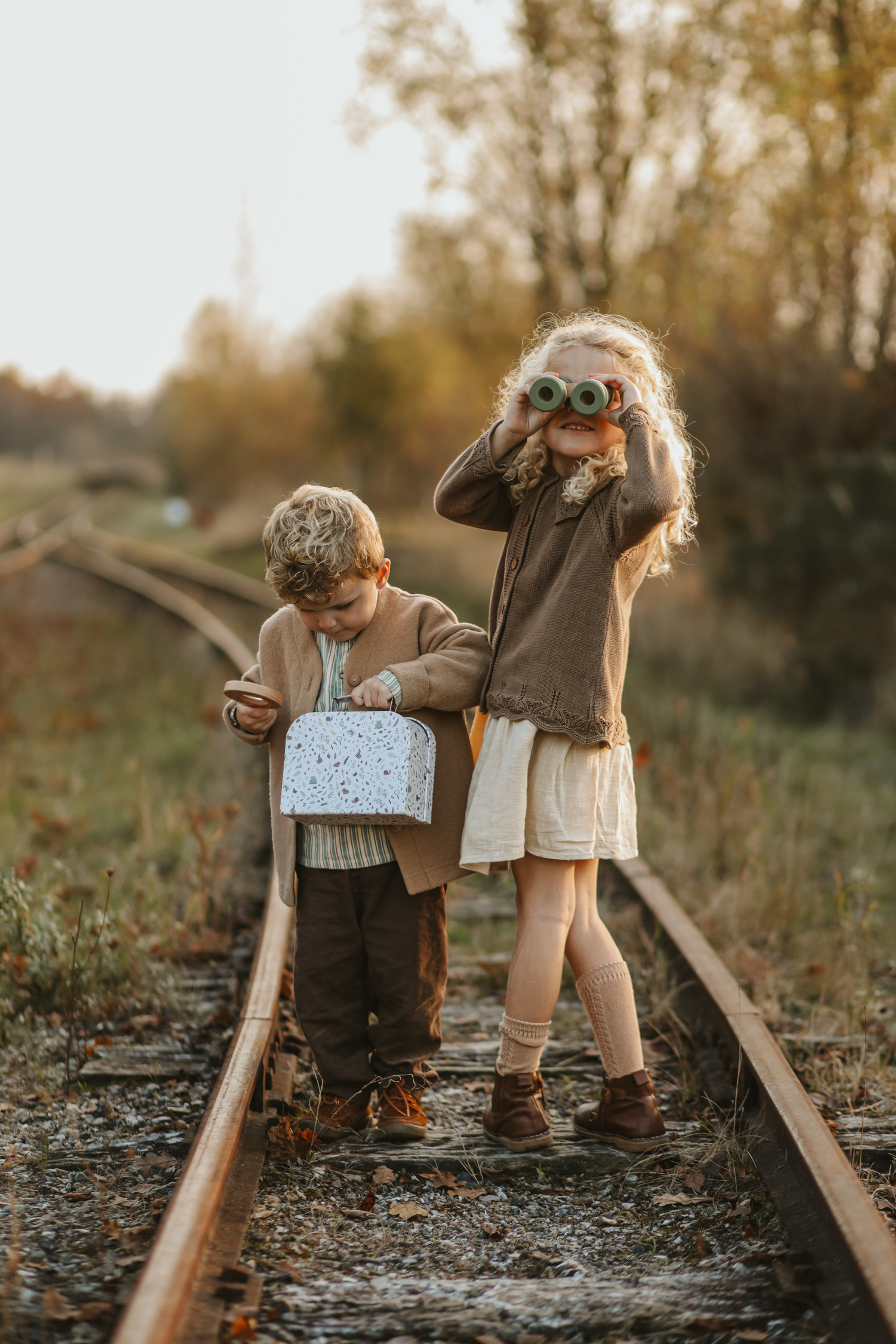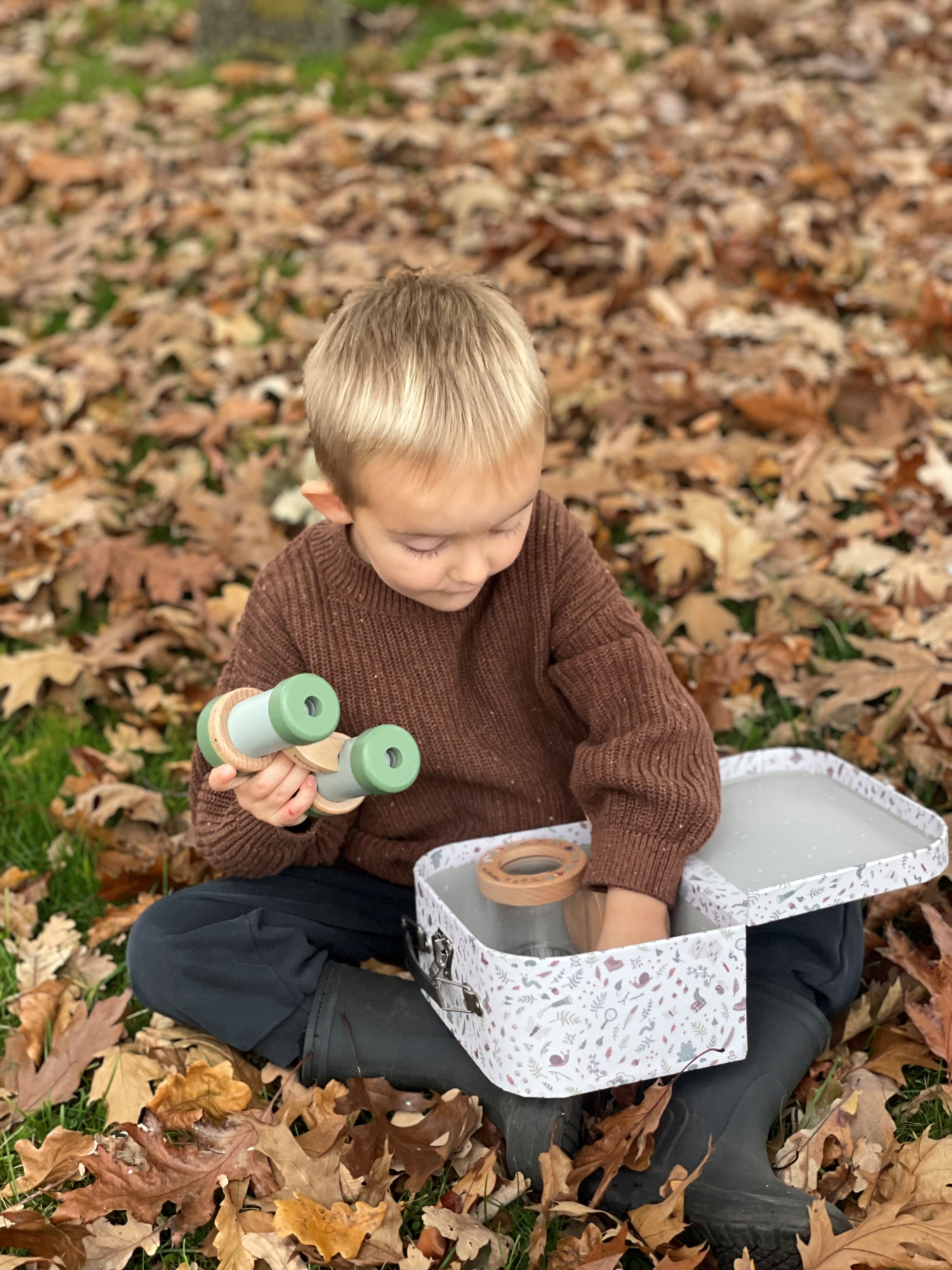 Kufferten indeholder bÄde kikkert, lup, kompas og insektglas, hvilket gÞr den til et komplet sÊt for smÄ opdagelsesrejsende. Samtidig skaber den mulighed for gode snakke om natur, dyr og det at passe pÄ omgivelserne.