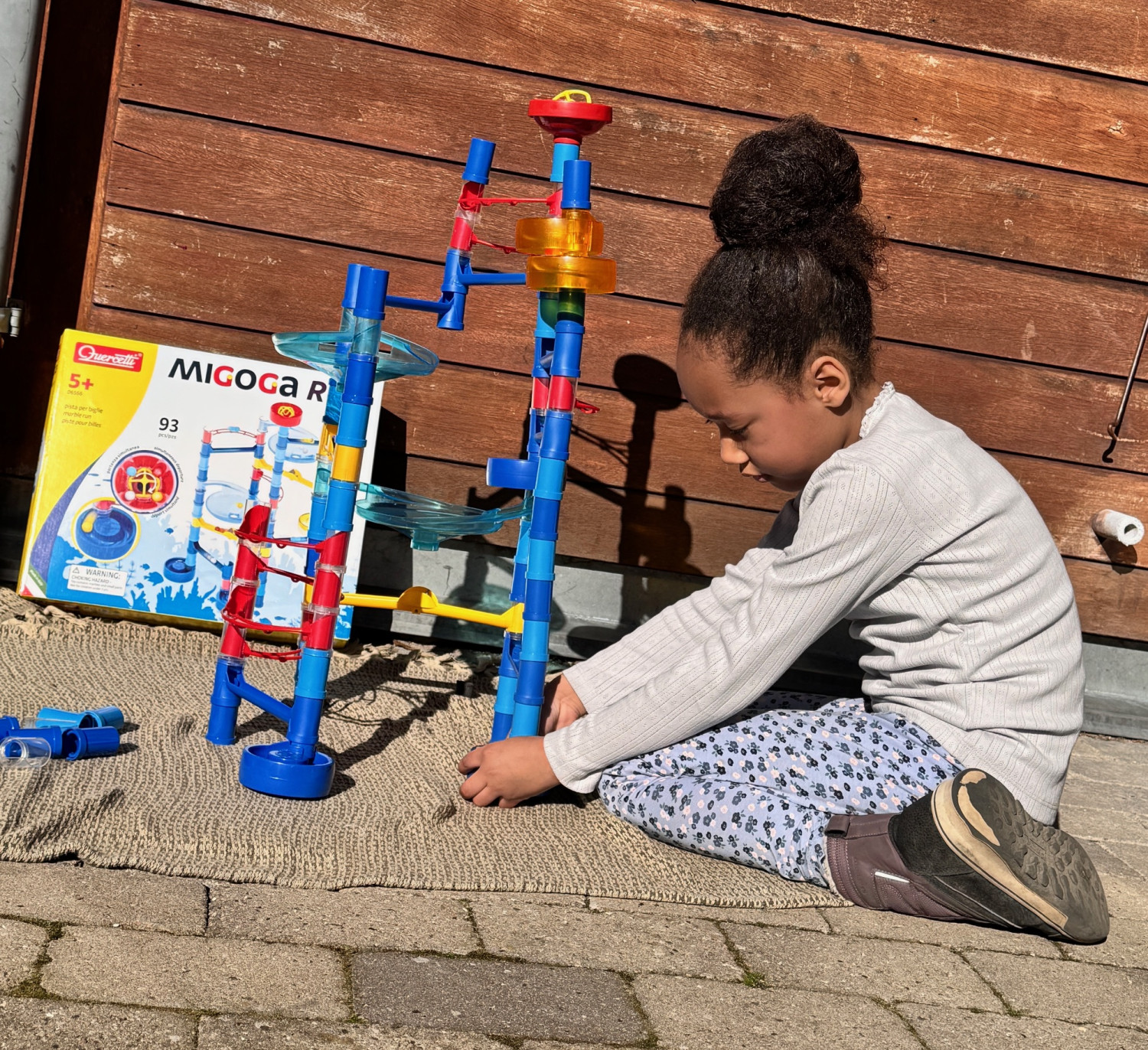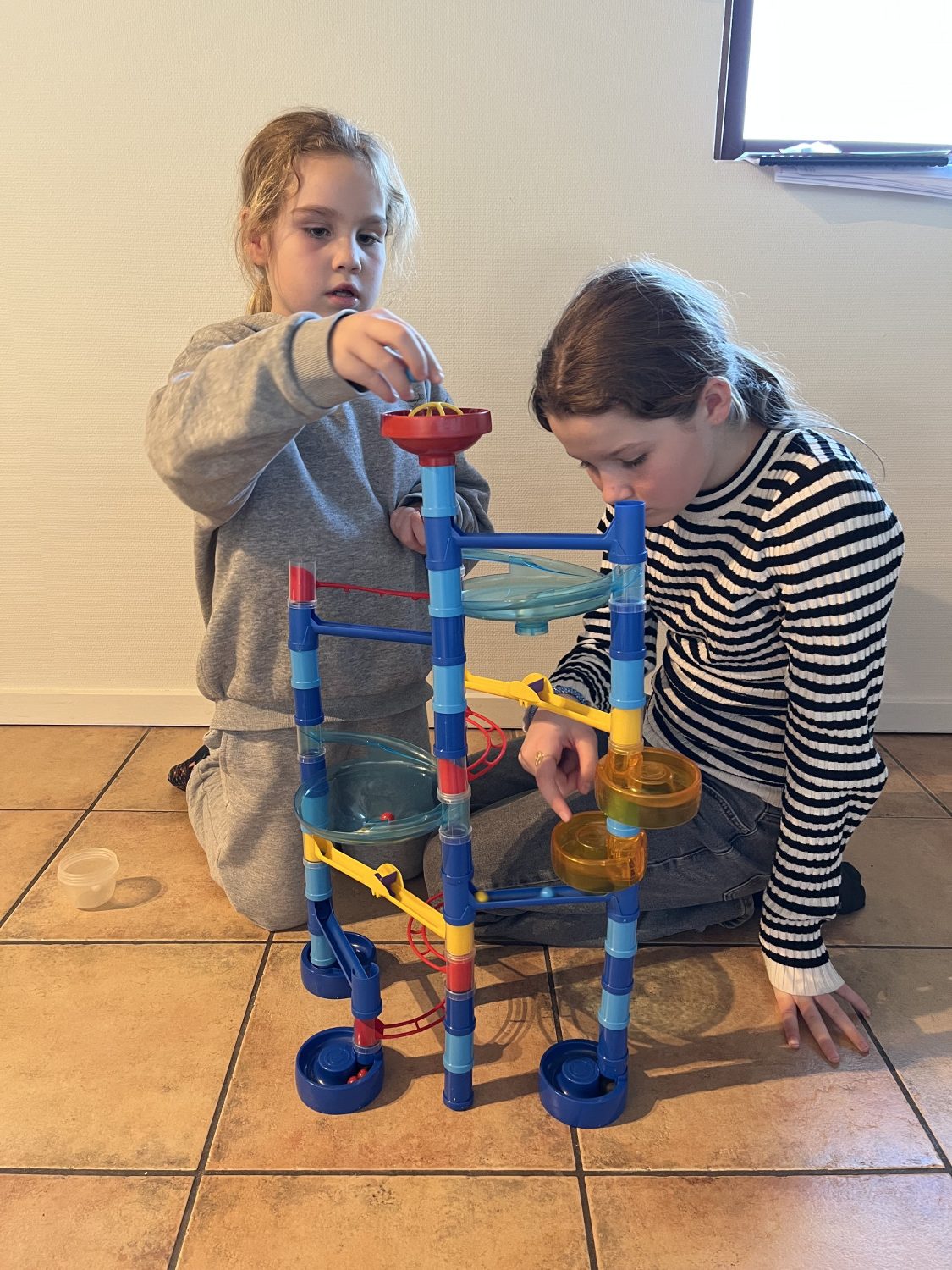 Storesøster Naya deltog ogsü i legen, og sammen fik de bygget en bane, hvor kuglerne kunne trille hele vejen fra top til bund.