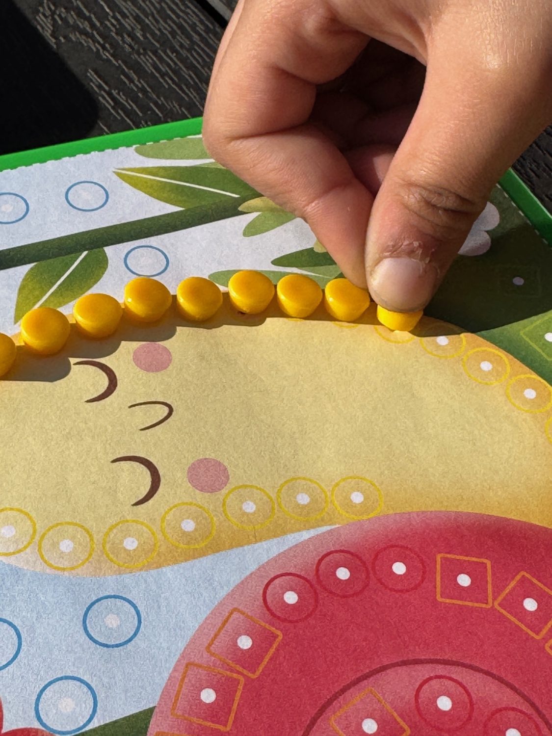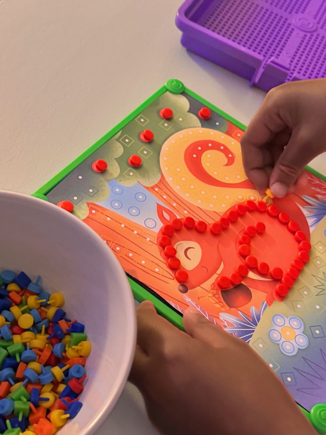 Børnene skaber mønstre og billeder ved at placere smĂĽ stifter eller knapper pĂĽ en plade â en aktivitet der styrker bĂĽde finmotorik og koncentration.