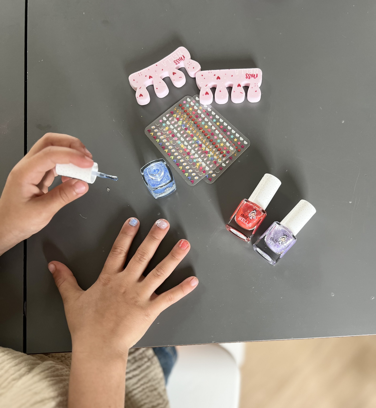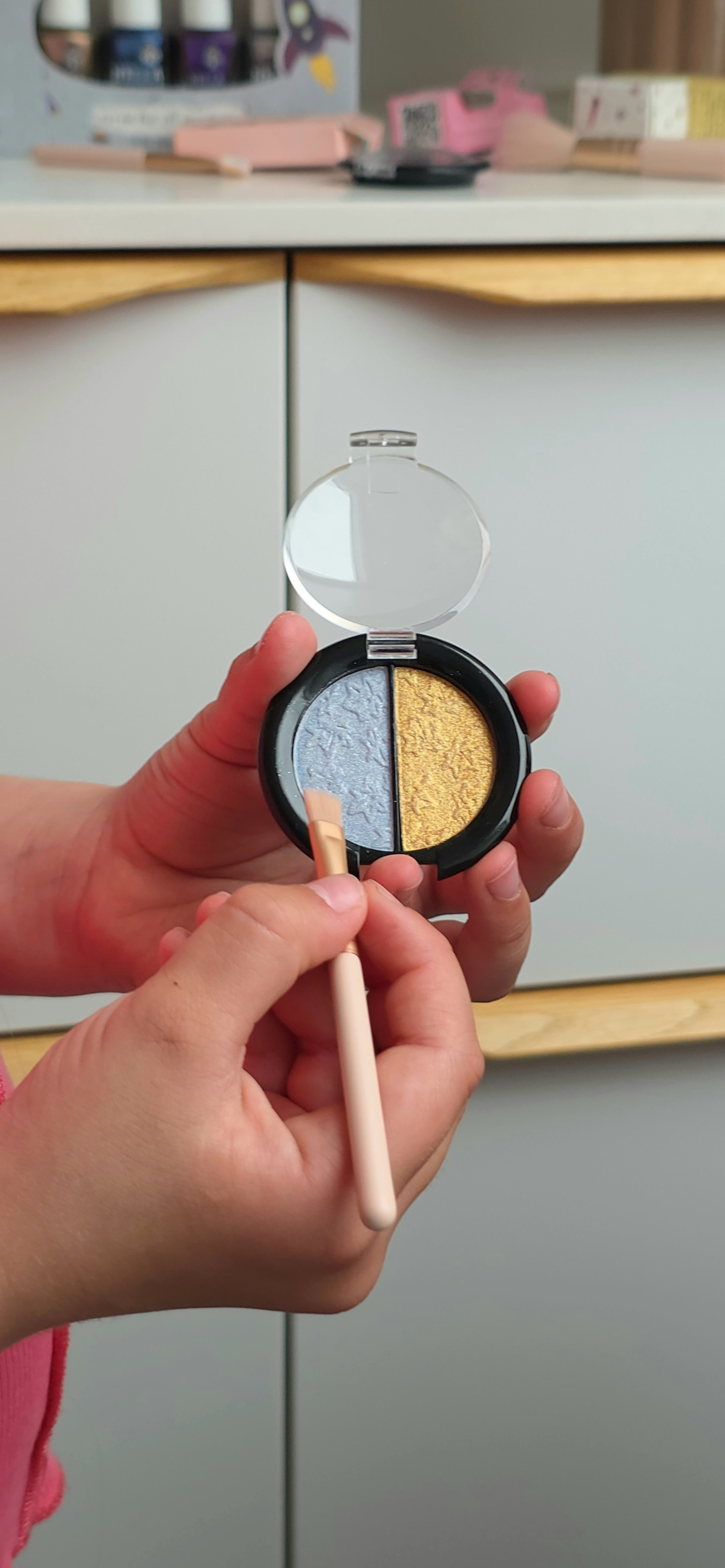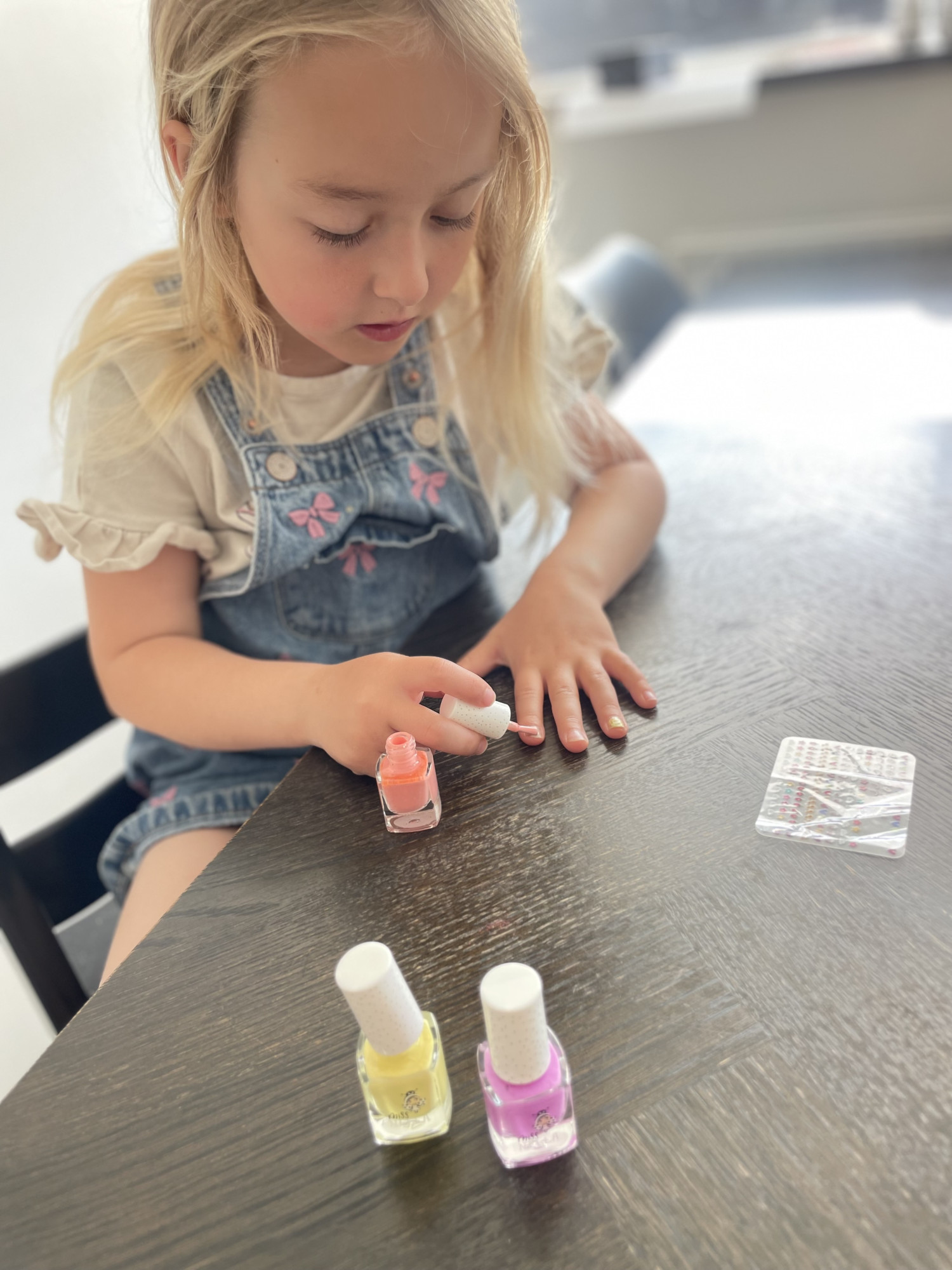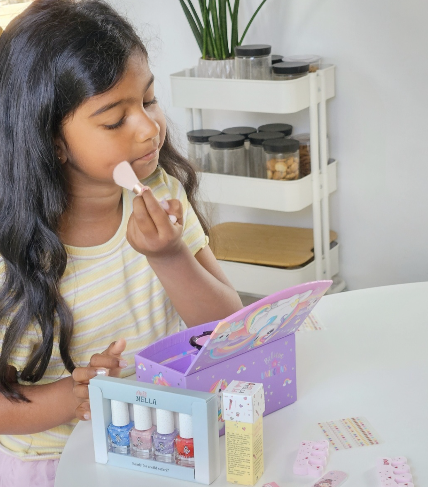 Sortimentet rummer blandt andet øjenskygge, blush, neglelak, lÌbepomade, børster, tatoveringer og accessories, sü børn kan lege skønhedssalon, efterligne de voksne og udfolde sig kreativt pü en tryg müde. Neglelakkerne kan desuden pilles af uden neglelakfjerner, hvilket gør dem ekstra børnevenlige i brug.