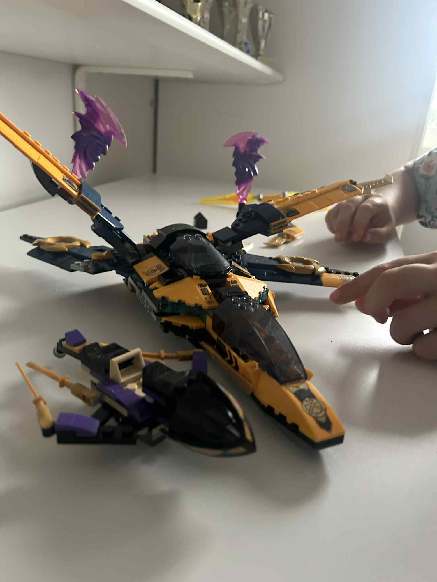 Sættet består af et sejt jetfly med flere funktioner, blandt andet bevægelige vinger, fjederbetjente skydere, aftagelig drone og redningskapsel. Derudover følger der tre minifigurer – Arin, Ras og en dragonisk kriger – som giver masser af muligheder for rolleleg og ninjaeventyr.