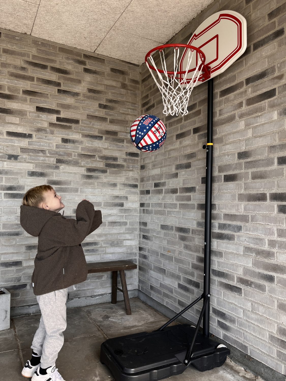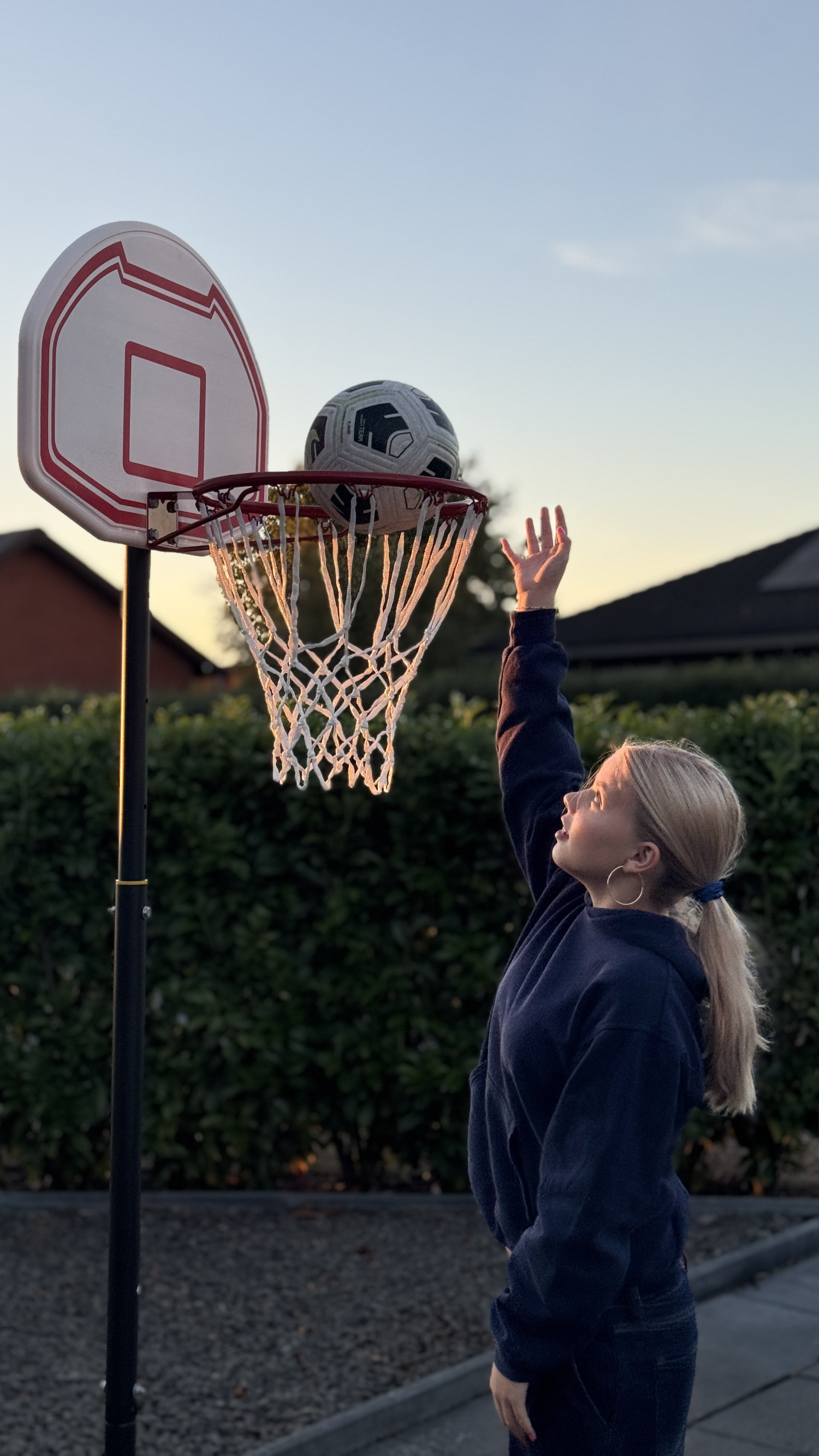 "Nu har vi også fået én basketballstander i indkørslen, som kan køres rundt som vi synes. Den er nemlig udstyret med hjul, så det er nemt at flytte rundt."