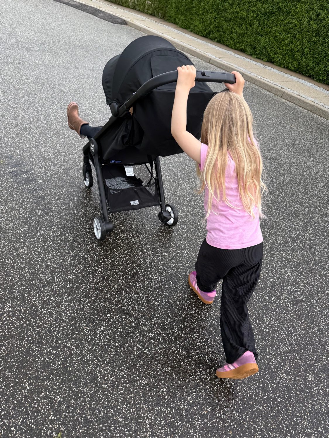 Familien har testet klapvognen mange steder: pÄ ture i byen, pÄ forskellige underlag og i hverdagen, hvor bÄde bÞrn og voksne har skubbet den rundt. Patricia fremhÊver isÊr, hvor nem den er at manÞvrere, og at Edith allerede har taget flere gode lure i den.