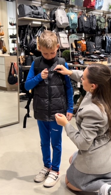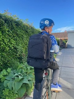 Aske pü 9 ür har testet JEVA Survivor i modellen Spray. Familien besøgte Helm i Kolding, hvor de fik grundig vejledning og hjÌlp til at indstille tasken korrekt. Survivor-modellen rummer 26 liter og er velegnet fra 3. klasse og op.