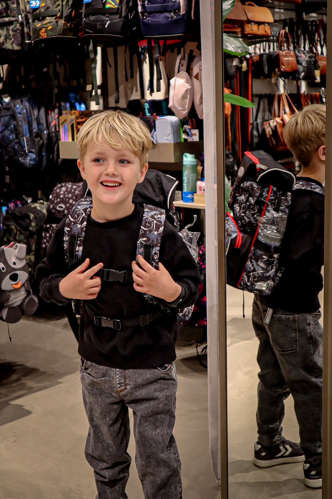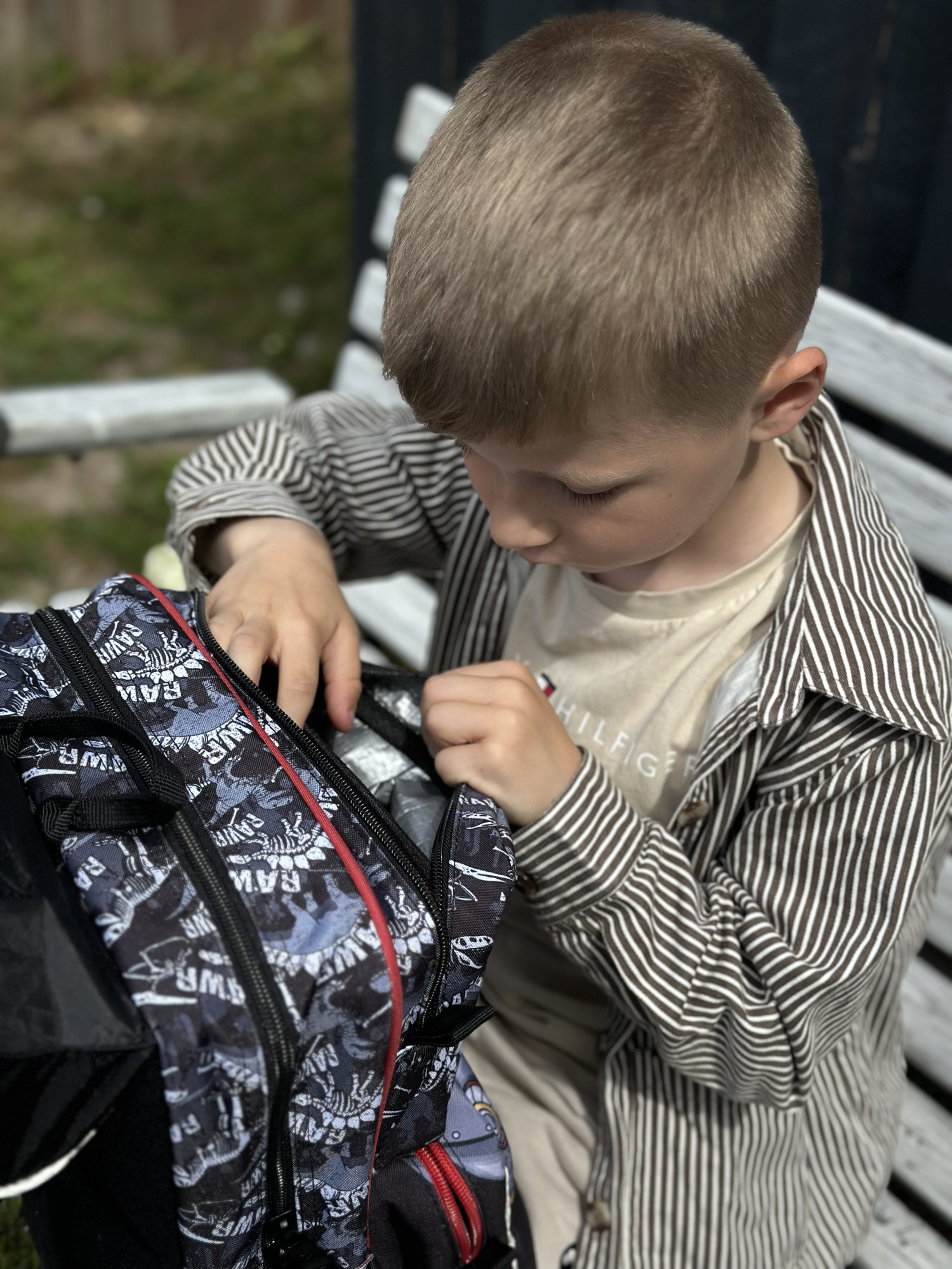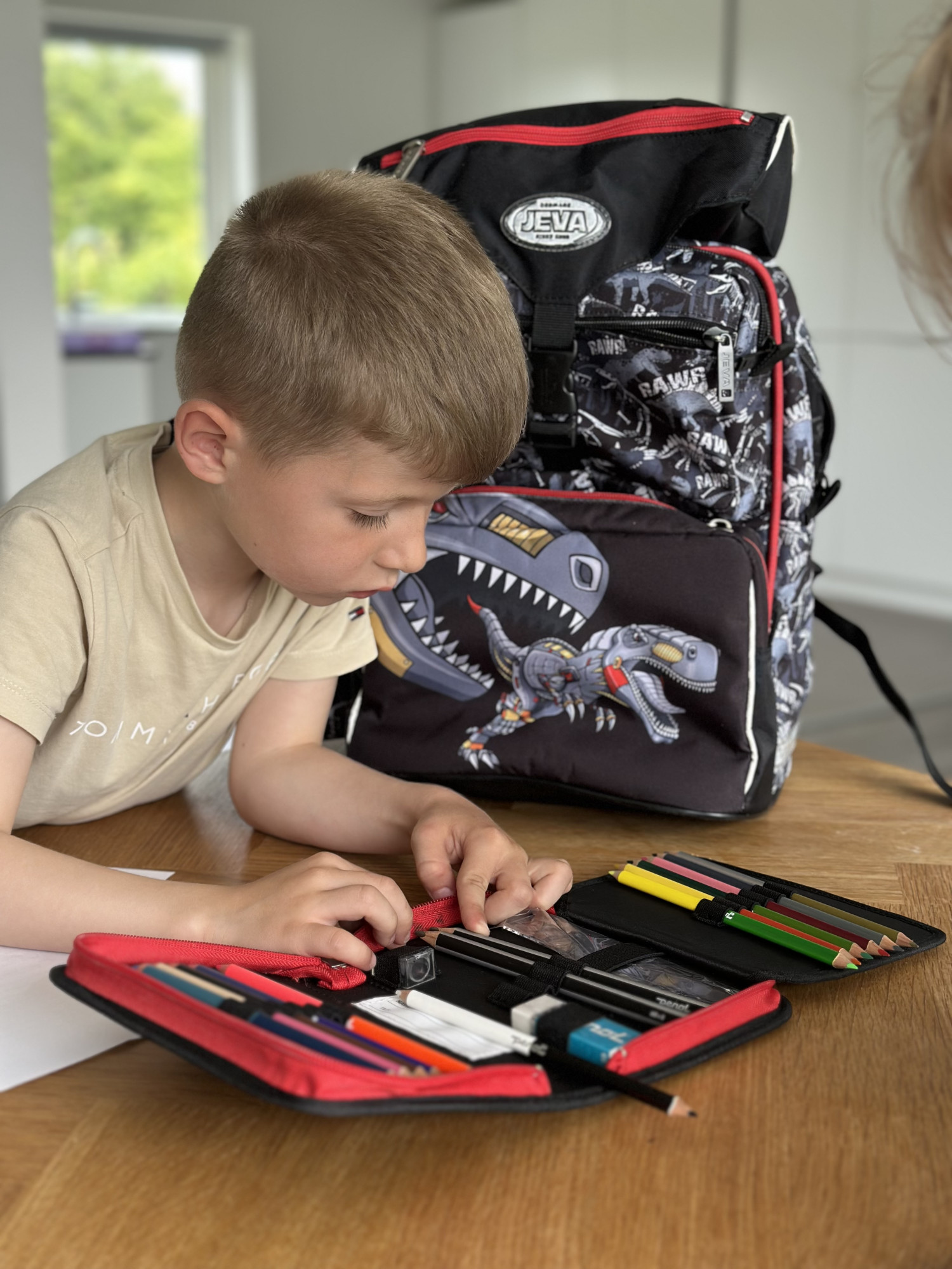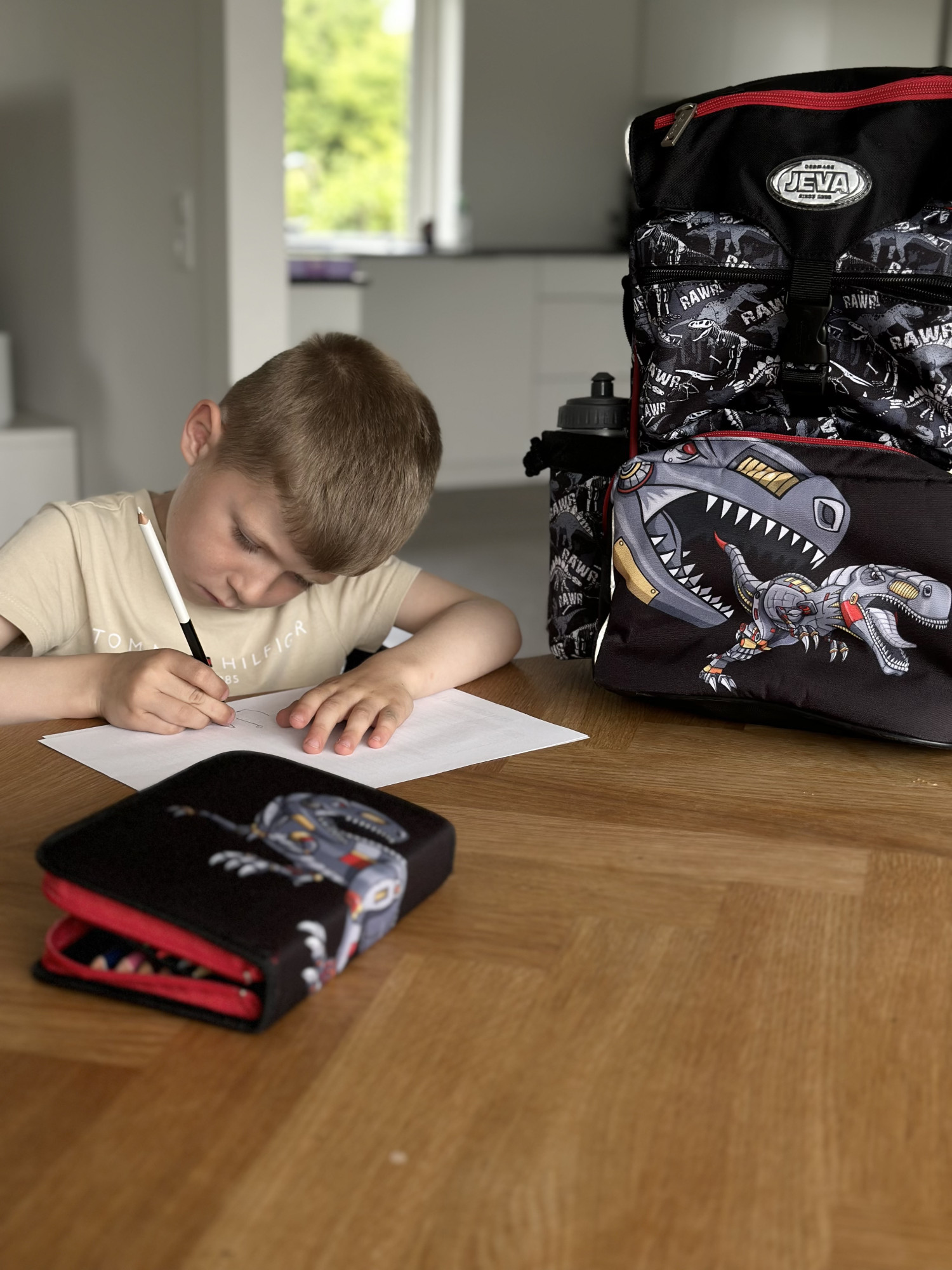 Felix skulle starte i Glidende overgang og glÌdede sig helt vildt til sin første rigtige skoletaske. Besøget i HELM i Kolding Storcenter blev en stor oplevelse, hvor han selv fik lov at vÌlge sin taske og blive guidet gennem alle funktionerne. Han faldt hurtigt for en JEVA Beginners med dinosaurer, og siden har tasken vÌret med hver eneste dag.
