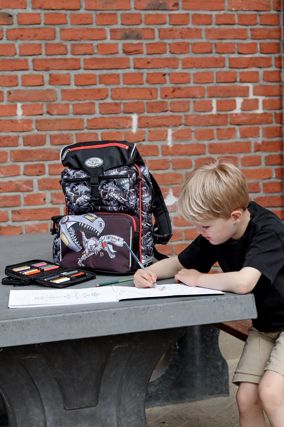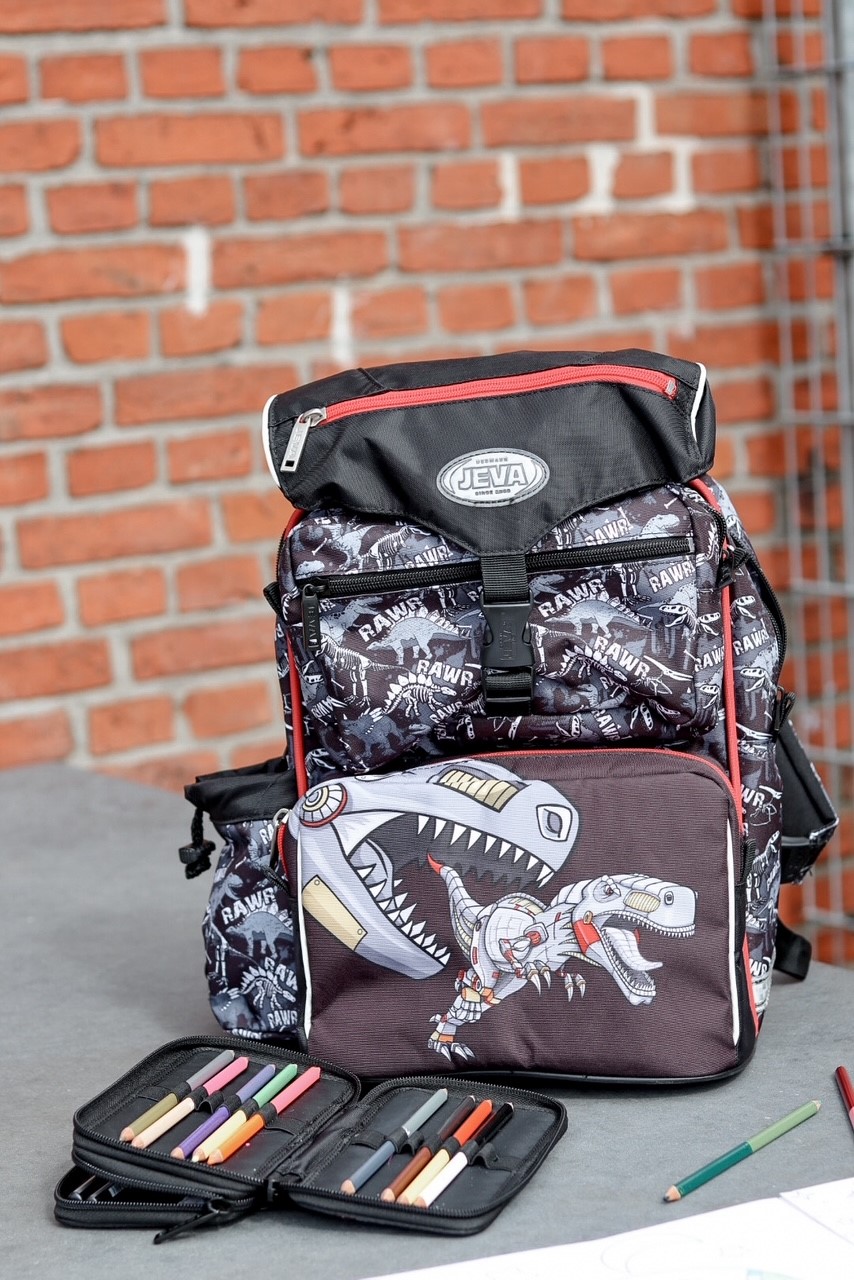 Liam pü 5 ür har testet JEVA Beginners i farven Dinosaur Robot, samt det matchende JEVA Onezip penalhus med indhold. Her er det isÌr designet, det vandtÌtte materiale og den stÌrke ergonomi, der bliver fremhÌvet. Familien oplever tasken som büde gennemtÌnkt og meget børnevenlig.