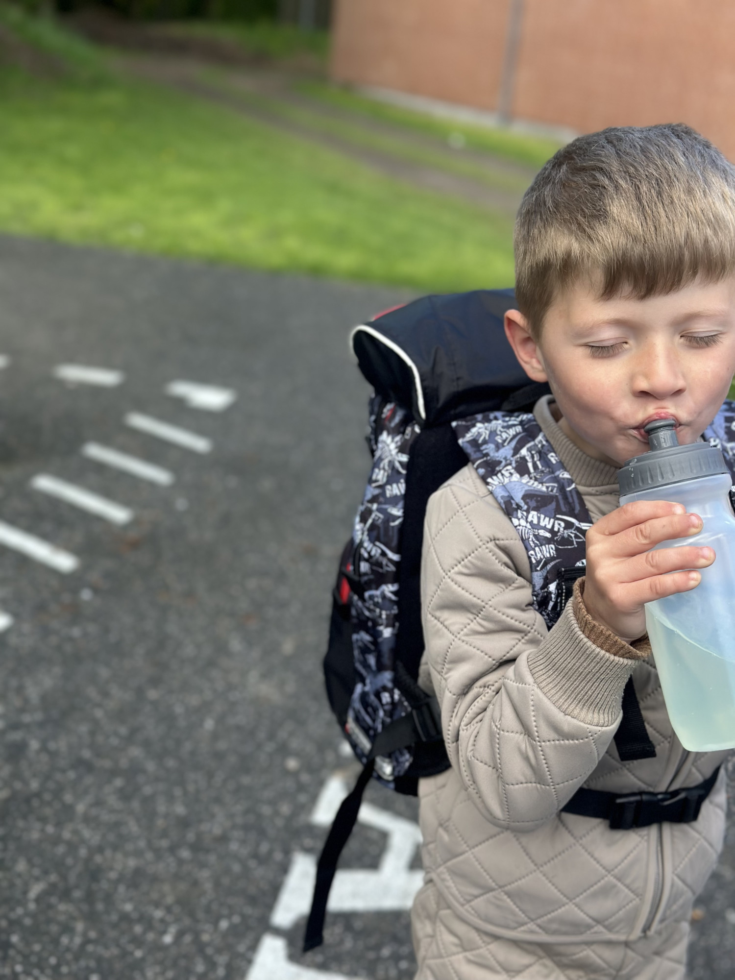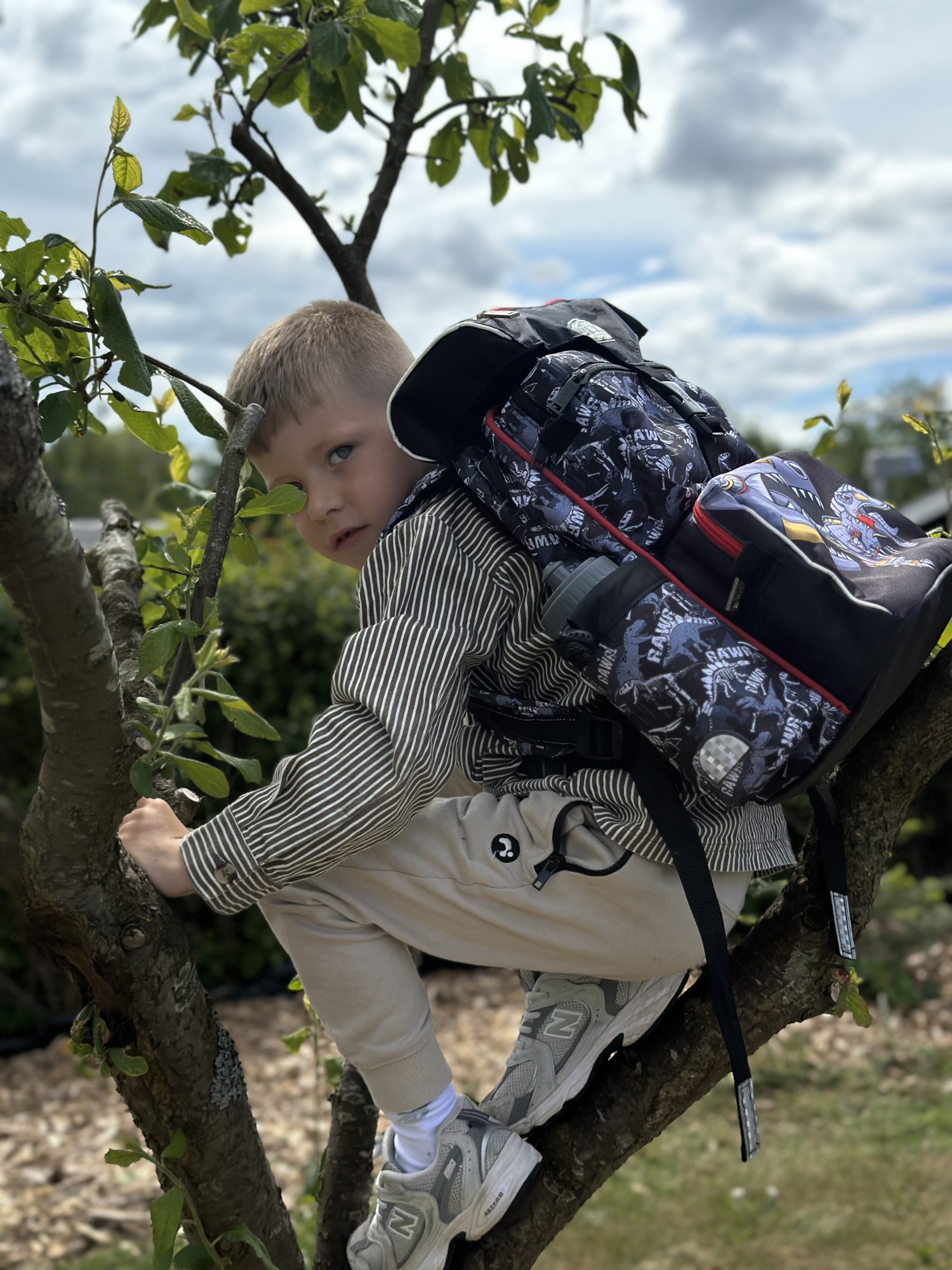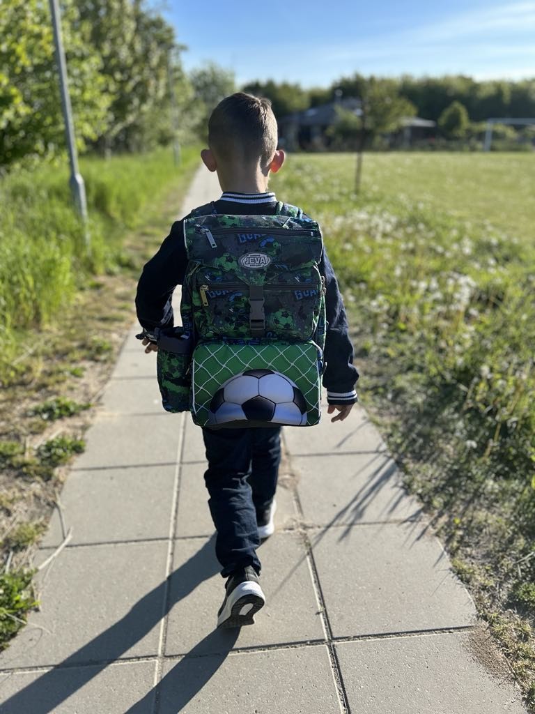 Matti skal starte i 0. klasse efter sommerferien og har testet JEVA Beginners i modellen Football. Familien fremhÌver isÌr, at tasken er let for barnet selv at bruge, og at gymnastikpose og drikkedunk følger med, hvilket gør pakken meget komplet.