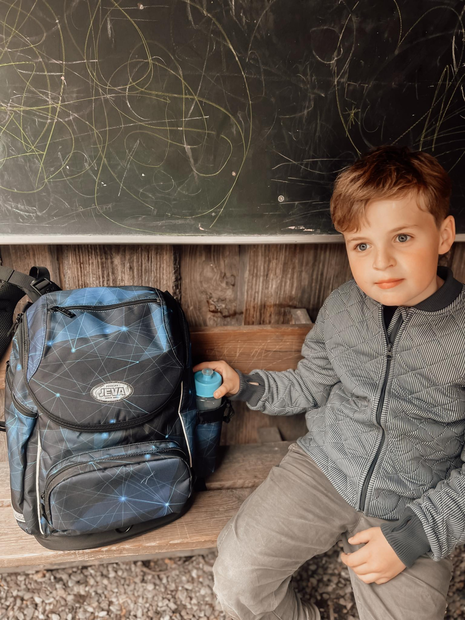 Felix med sin JEVA Beginners â den første skoletaske, der gjorde skolestarten ekstra stor
