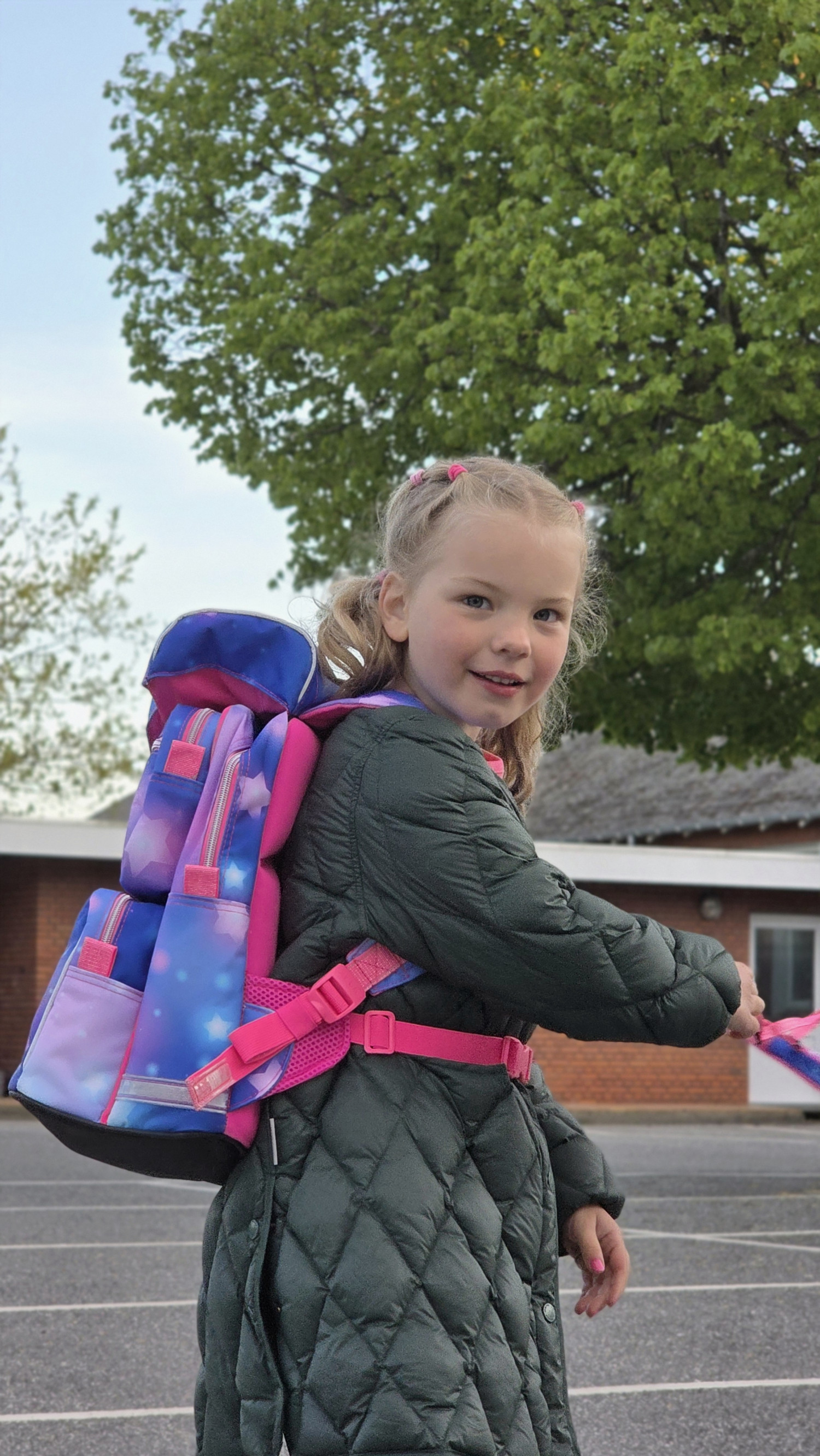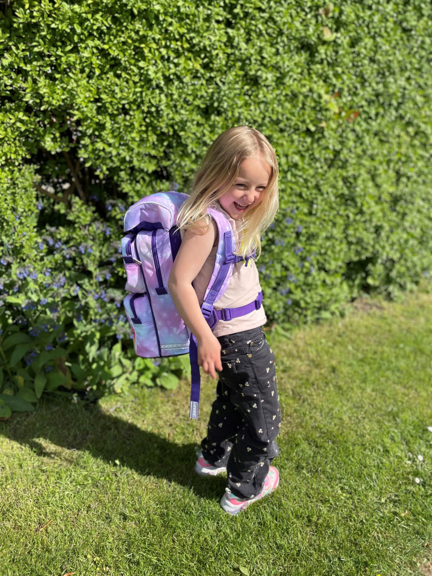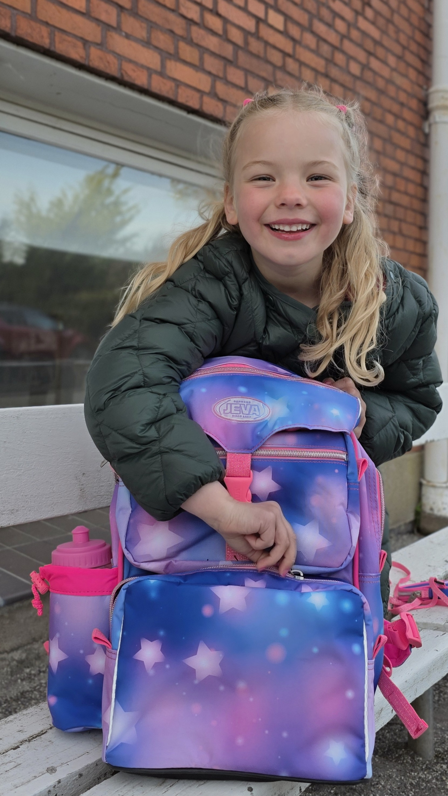 Anita er startet i forürs-SFO og skal begynde i 0. klasse til sommer. Hun valgte selv JEVA Beginners i farven Supernova, og tasken blev hurtigt et stort hit. Irina fremhÌver sÌrligt taskens ergonomiske støtte, den overskuelige indretning og de mange medfølgende dele.