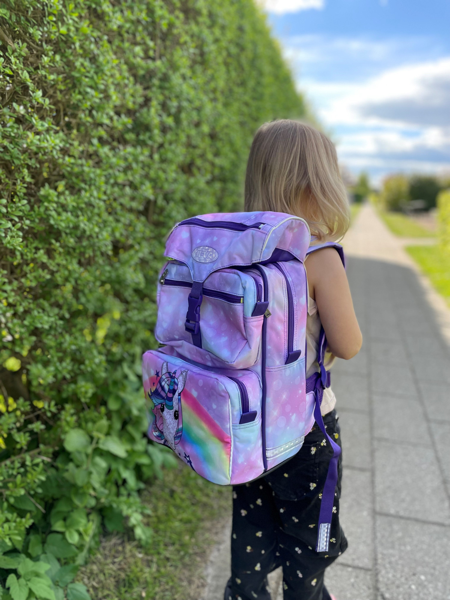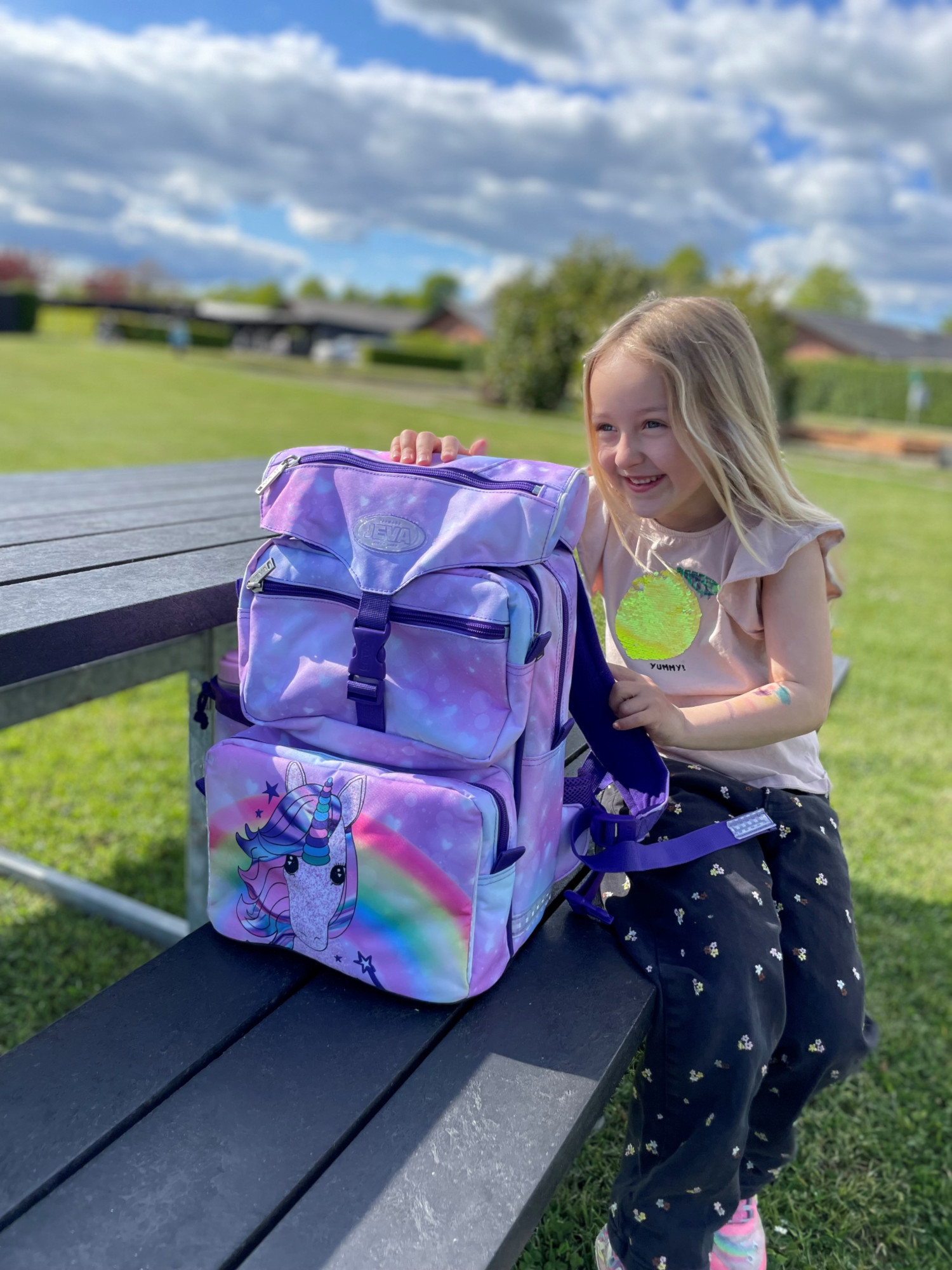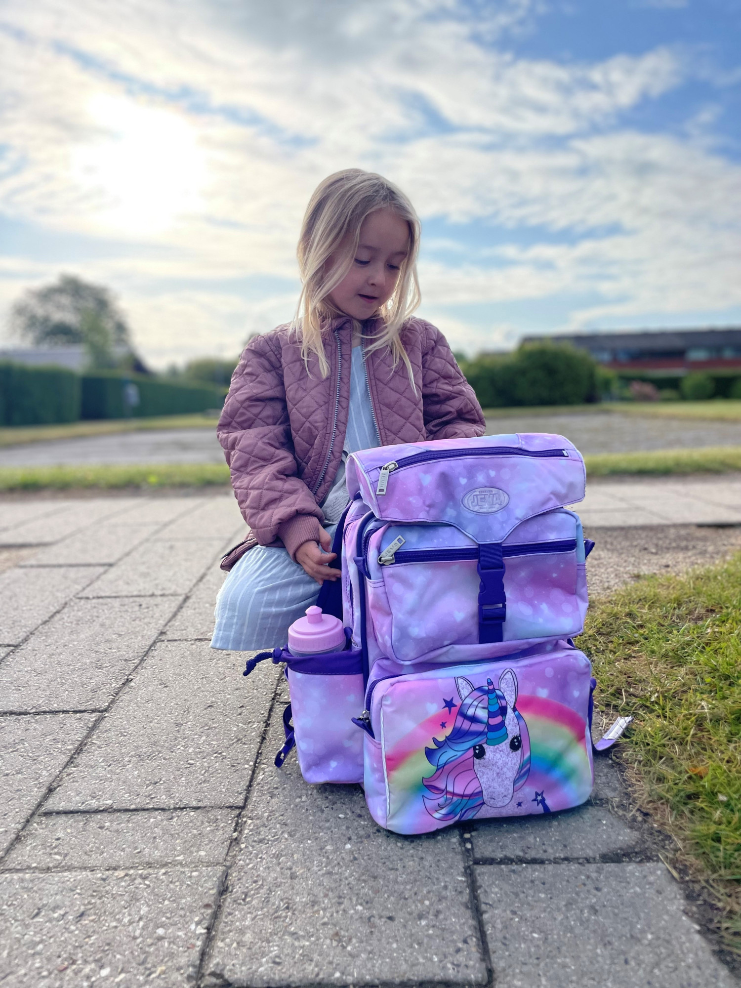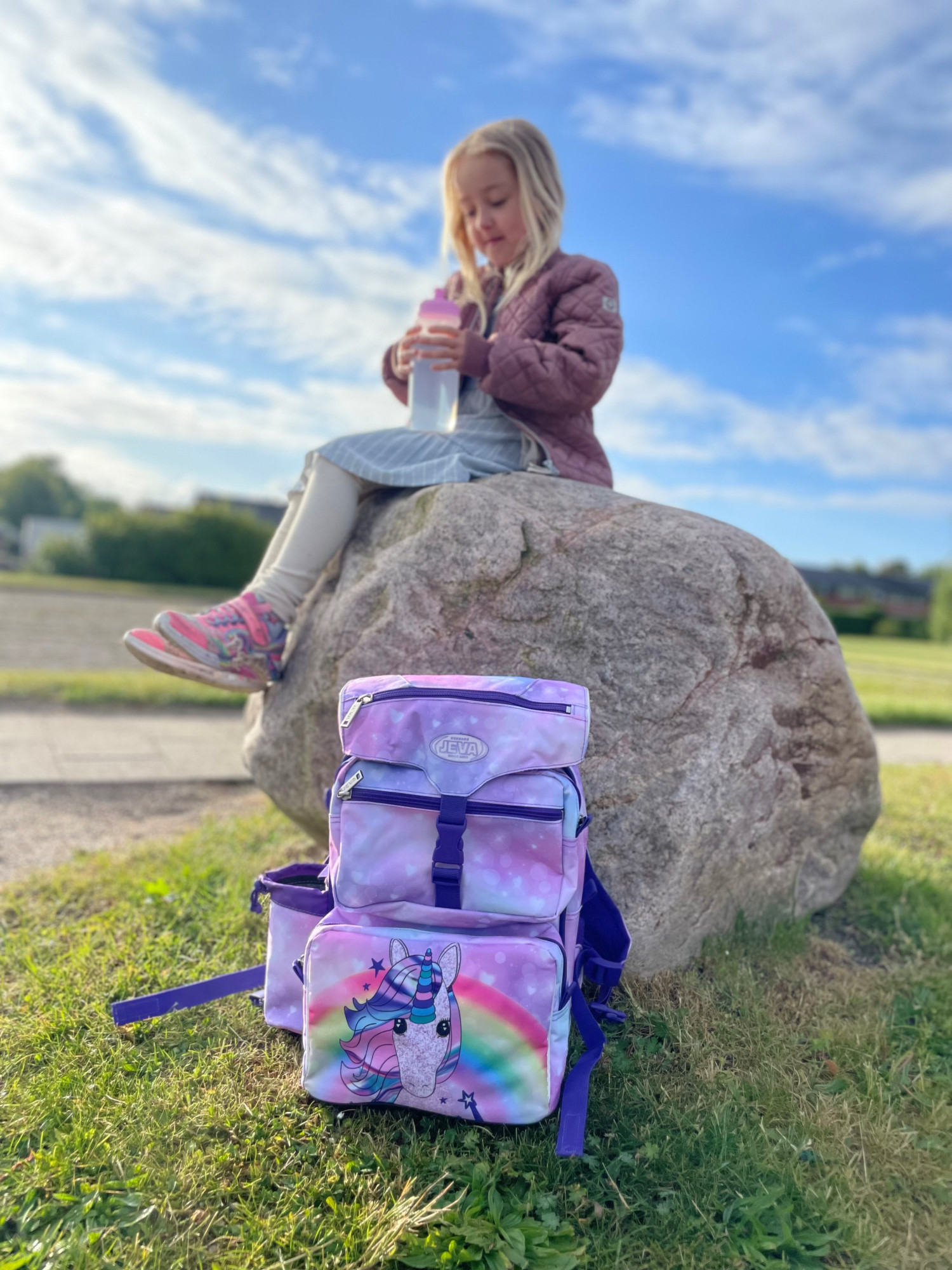 Silje pü 6 ür har testet JEVA Beginners med et design med enhjørning og regnbue. Tasken blev et stort hit med det samme, og Jeanne fremhÌver isÌr komforten, det isolerede rum til madpakken og den gode størrelse til skolestarten.