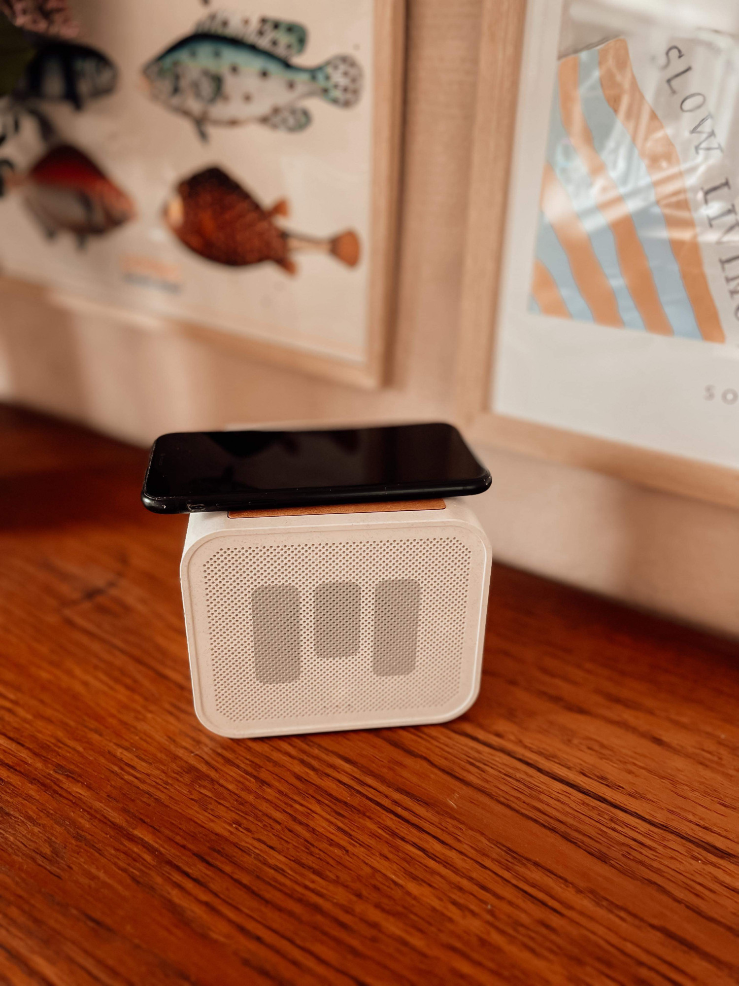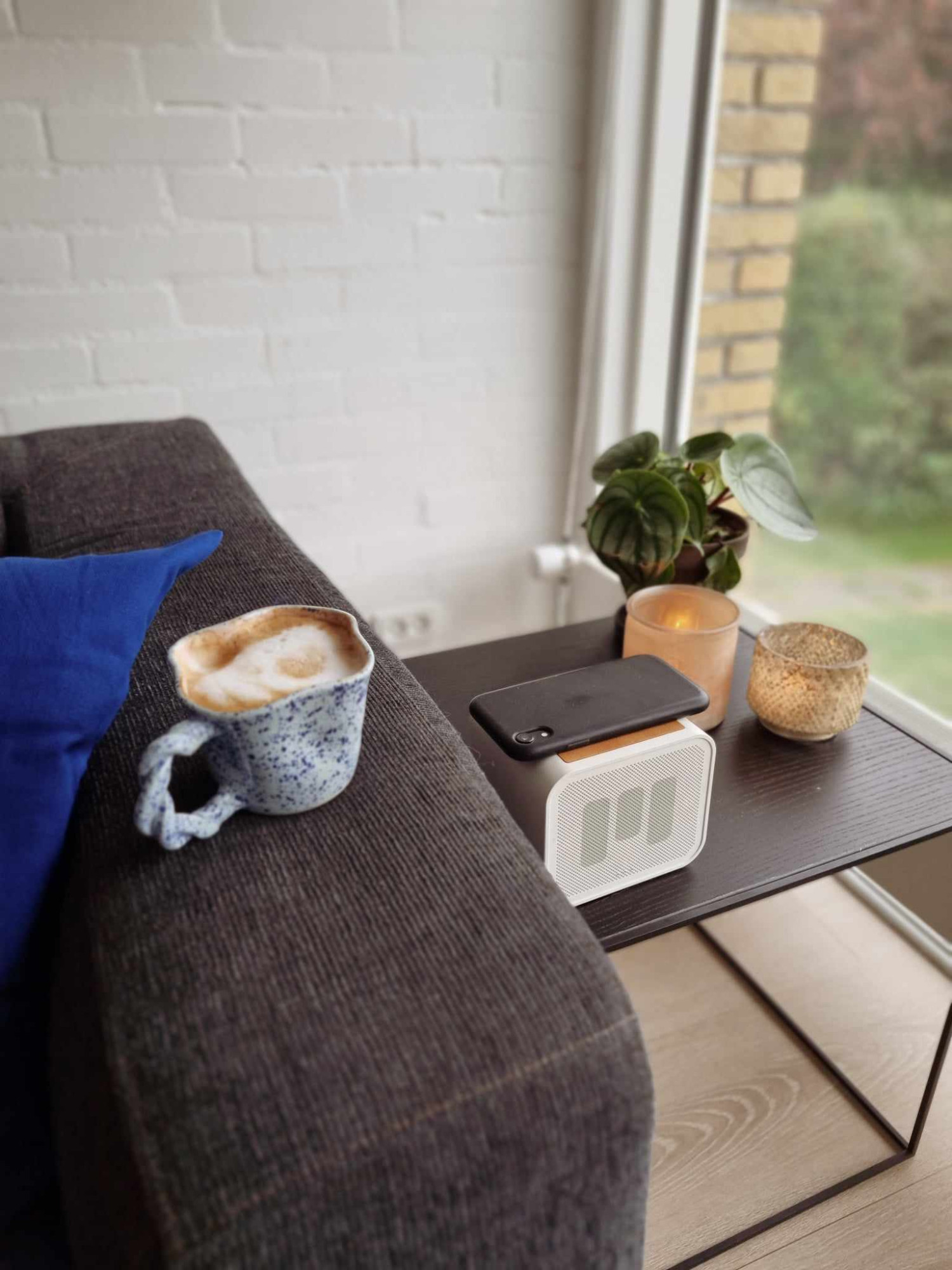 Såvel opladestation som højttalerfunktion kan bruges både trådløst og med ledning, og derfor har vi flyttet rundt på den i et væk f.eks. køkkenbordet, badeværelset, natbordet eller i reolen. Man får op til 16 timers trådløs musik per opladning. Benytter du samtidig powerbank-funktionen vil batteritiden dog være kortere.