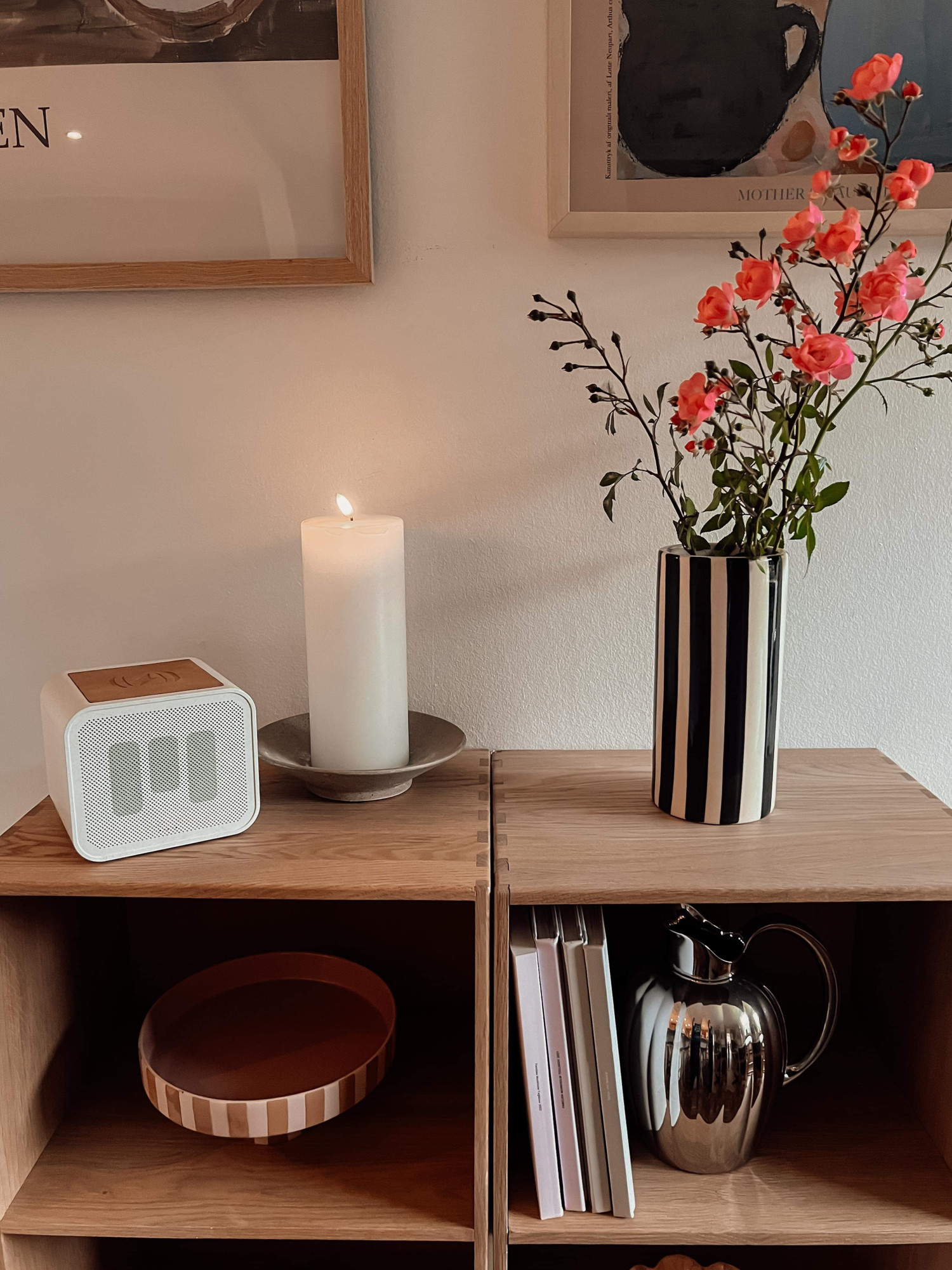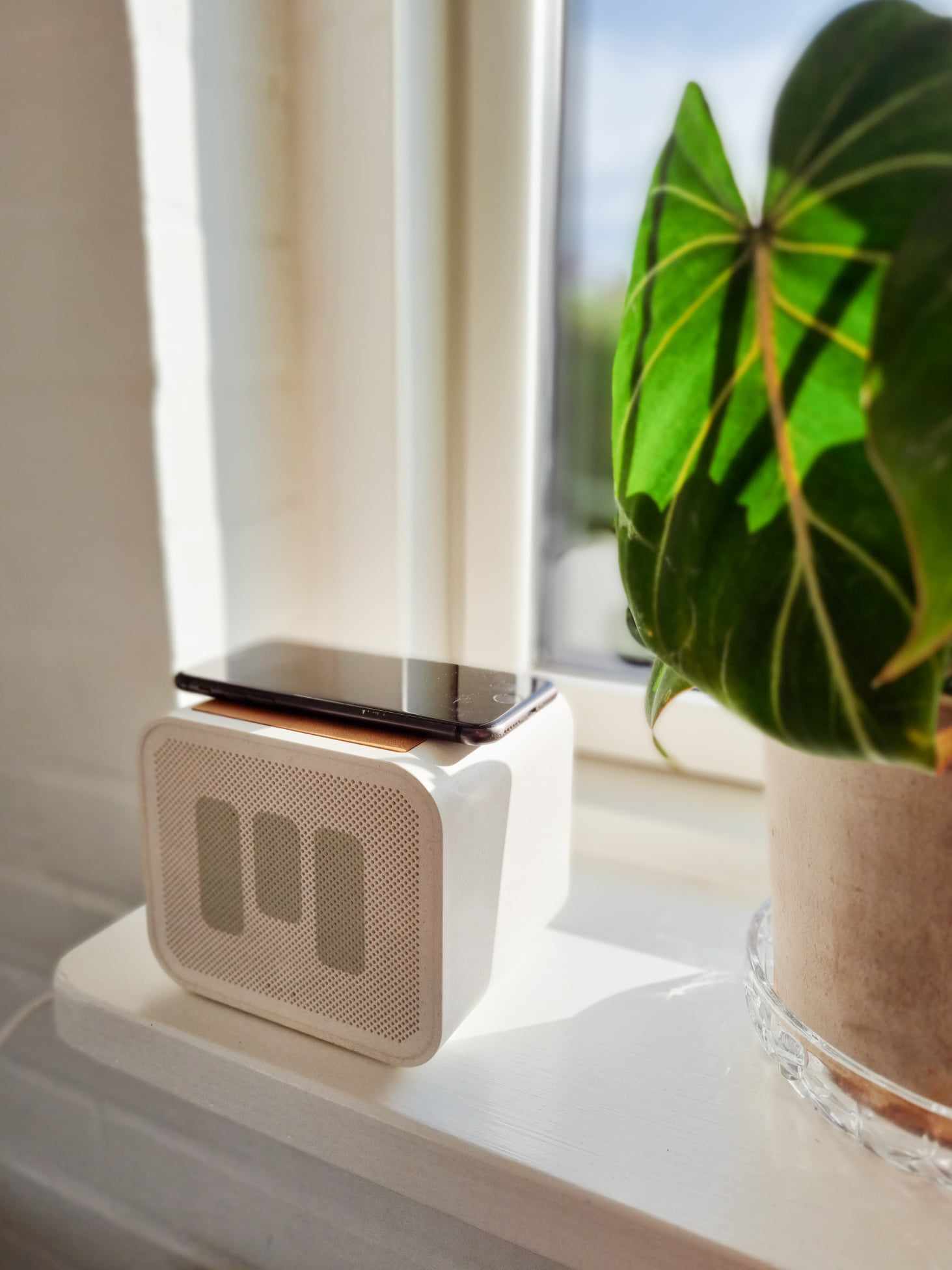Designet på højttaleren er i øvrigt virkelig lækkert! Den fås i hvis og i sort, og særligt den hvide er jeg begejstret for, fordi den har de lækre cognac-farvede PU-læderdetaljer på toppen, som også er skridsikkert. Den ser bare lækker ud at have stående frem for en omgang ledninger.