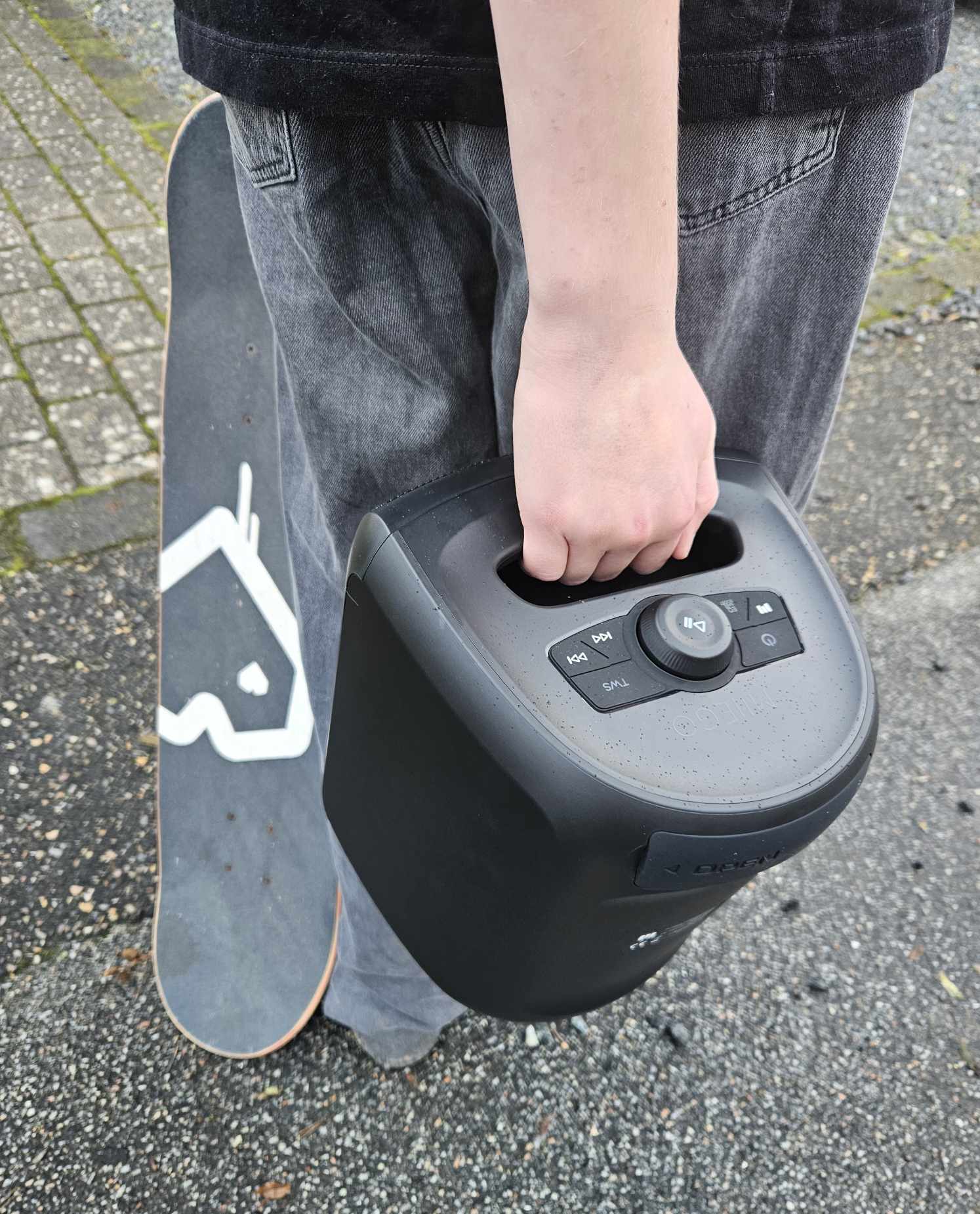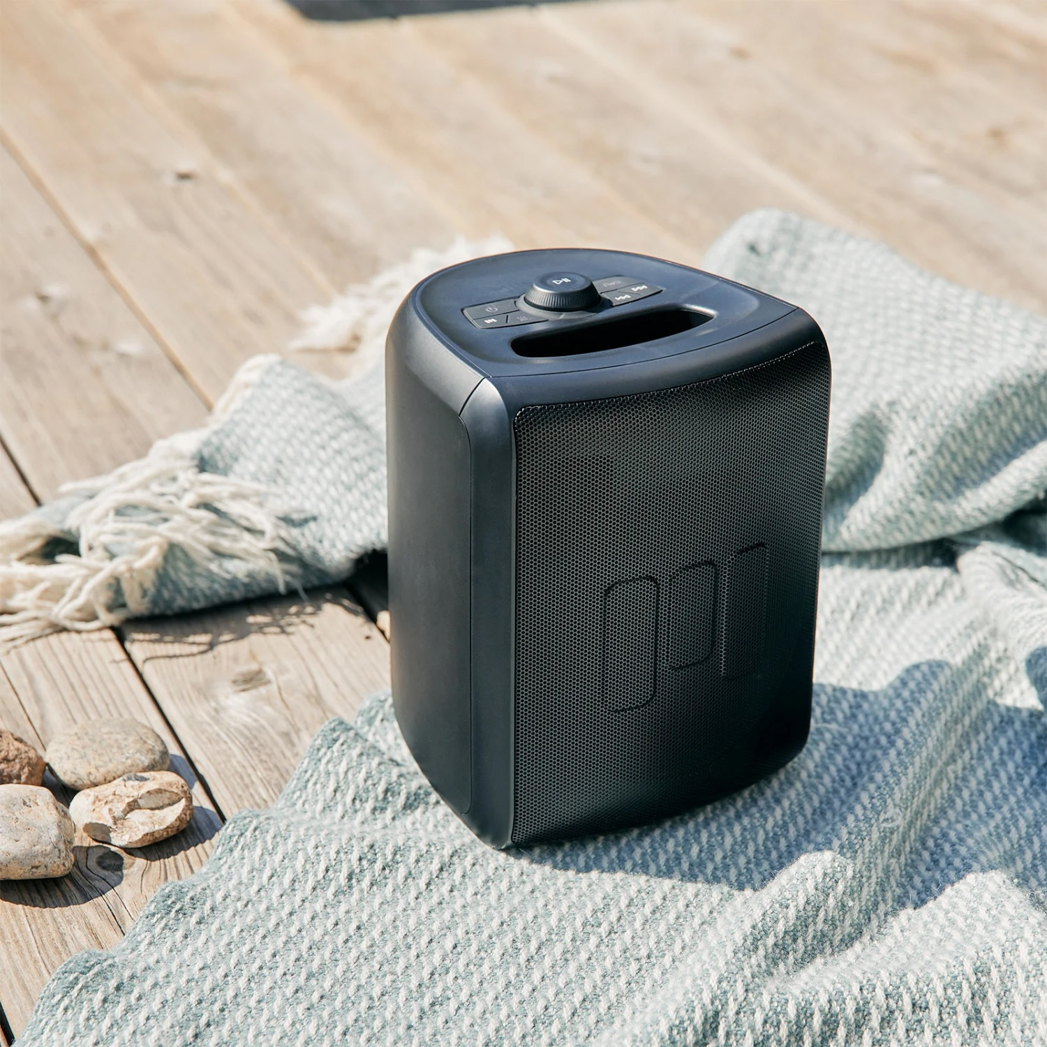 Den har et flot, simpelt og stilrent design, hvilket gør, at den passer ind i de fleste hjem. Den er super nem at tilslutte mobilen og ikke mindst at betjene. Lyden kan styres direkte via din mobil eller på drejeknappen. Det er en højtaler, der føles meget robust, og som kan bruges både inde og ude, uanset vejr. Som et ekstra plus, så er den nemlig også vandtæt, så kan sagtens komme med på stranden en sommerdag, selv hvis det danske sommervejr svigter.