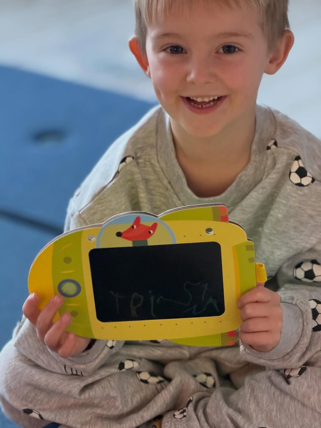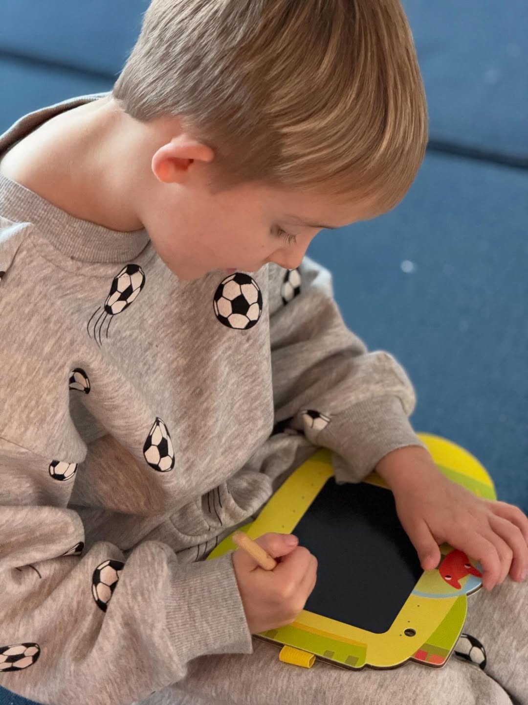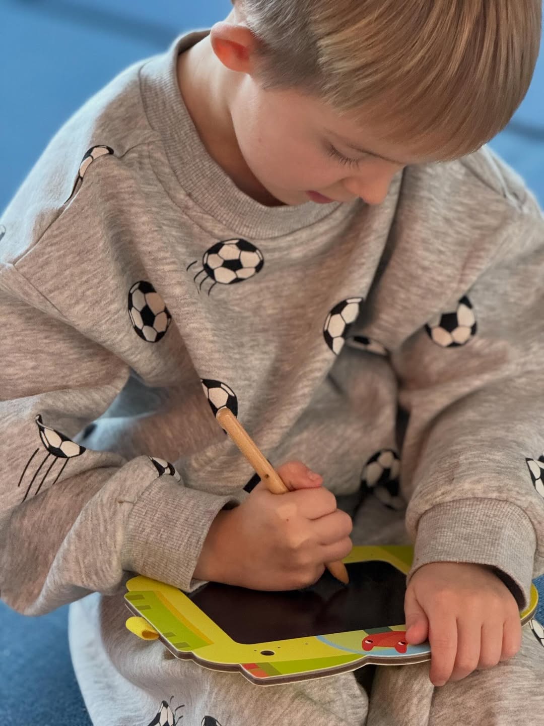 Tristan øver sig ihærdigt på at skrive sit navn og tavletavlen som han tester i samarbejde med @avenir_scandinavia, @andemorsverden og @testfamilien.dk er perfekt til det formål 👌🏼