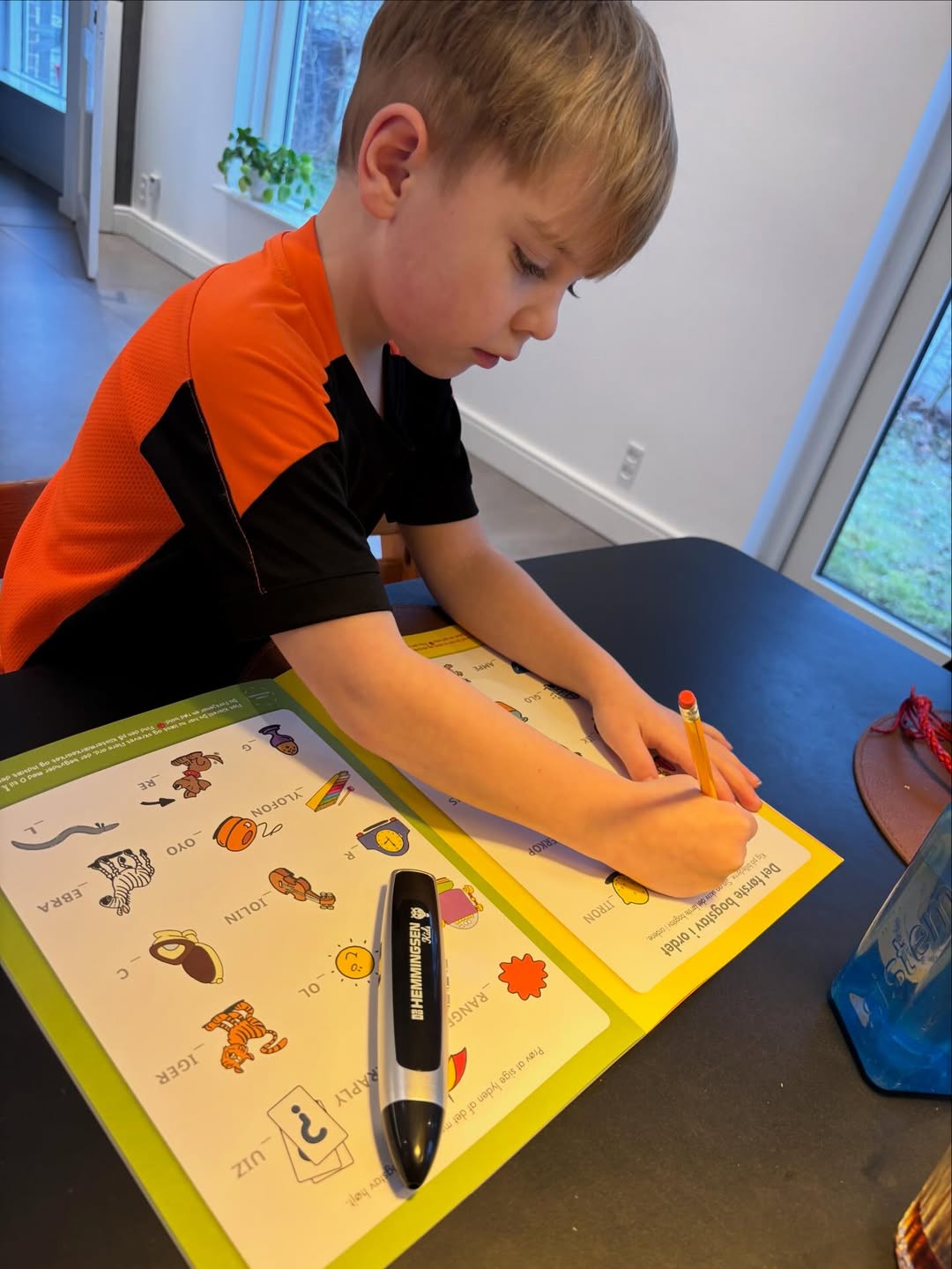 Lillebror Oskar blev så misundelig, at han også nuppede Læsepennen og hurtigt fandt ud af at øve sig på alfabetet.